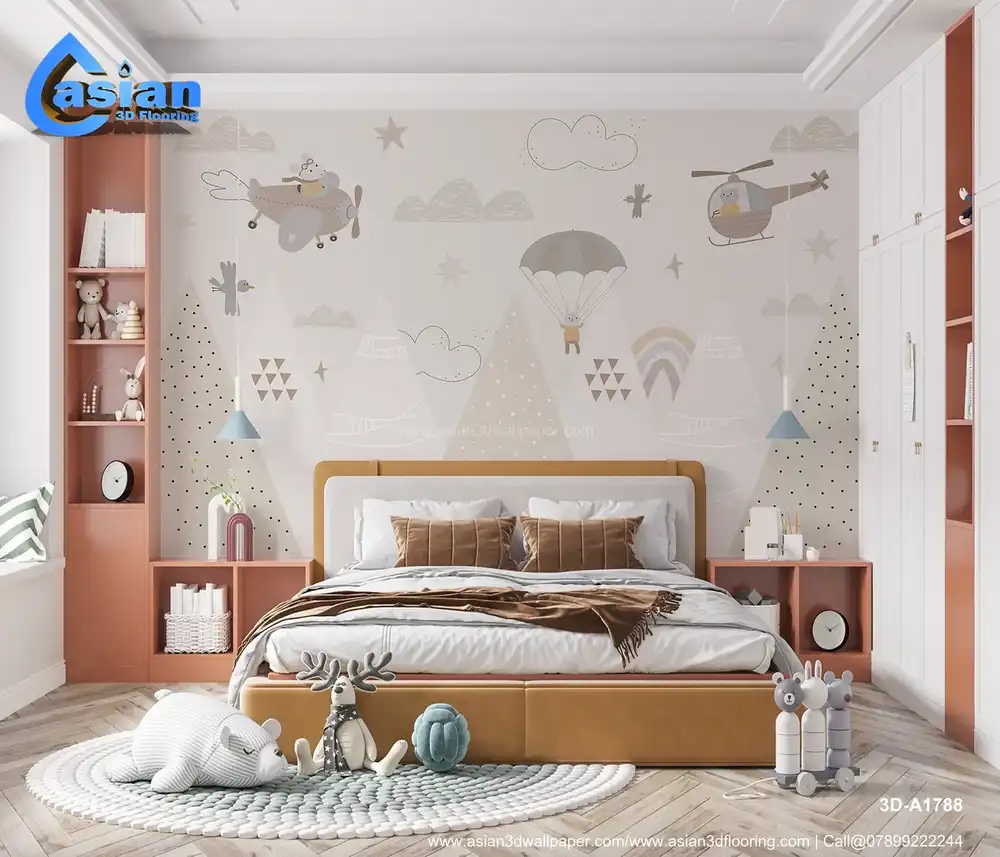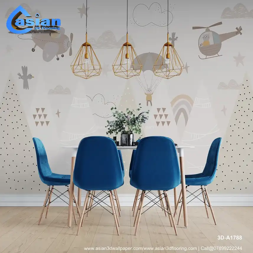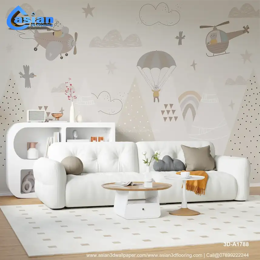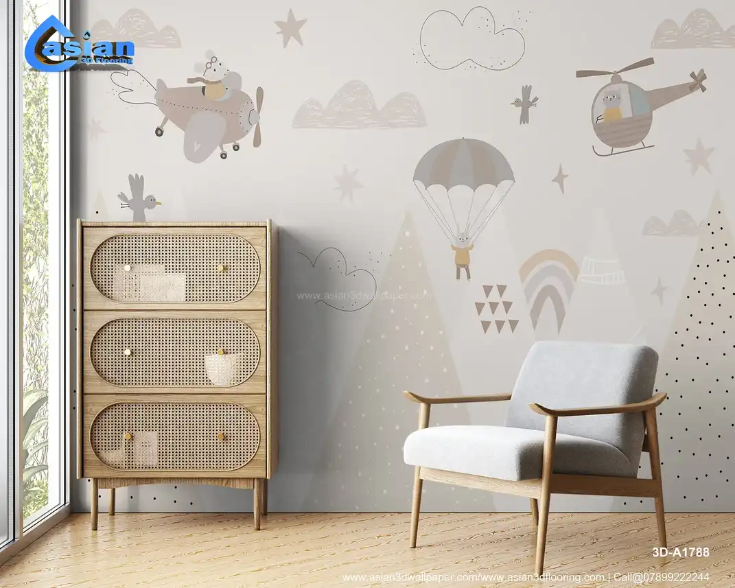 This delightful wallpaper brings a whimsical adventure to life with charming animals in airplanes, parachutes, and helicopters, soaring over a dreamy mountain landscape. Soft pastel tones make it a calming addition to nurseries or kids' rooms, fostering creativity and imagination. The playful design appeals to young adventurers, making it perfect for a nursery, playroom, or kids' bedroom decor. Benefits:- Inspires imagination, calming colors, cute design for kids