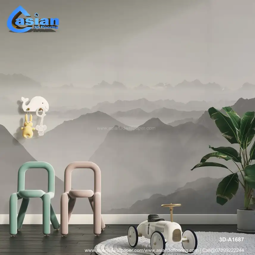 A stunning black-and-white wallpaper of a misty mountain range, offering a dramatic and serene landscape. The monochrome tones enhance the sense of depth, ideal for modern or minimalist interiors. Benefits:- Adds dramatic beauty to your space with serene black-and-white mountain ranges, perfect for modern or minimalist designs.