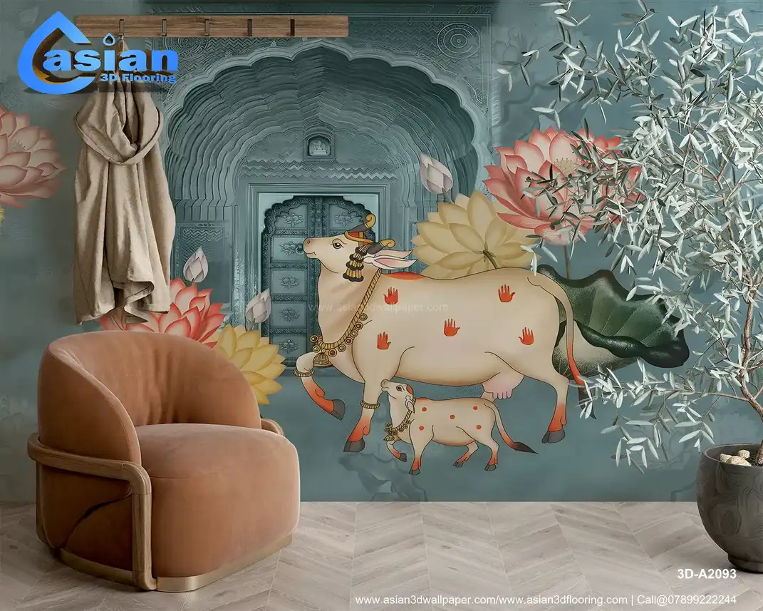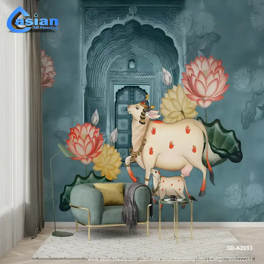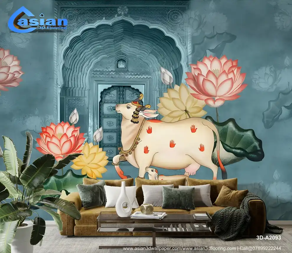 Blue Pichwai Style Wallpaper - Cow and Lotus Design for Lobby & Temple - Traditional Indian Wall Decor||3D-A2093