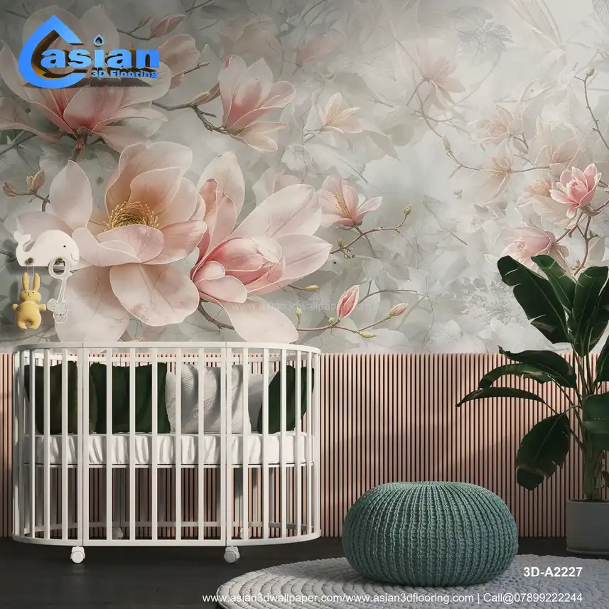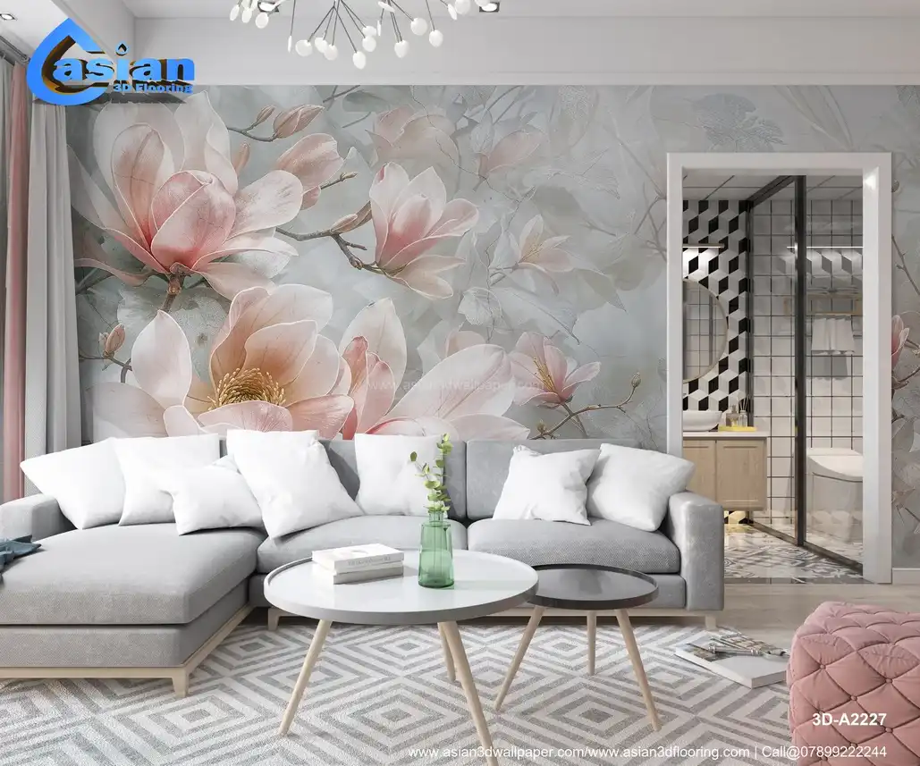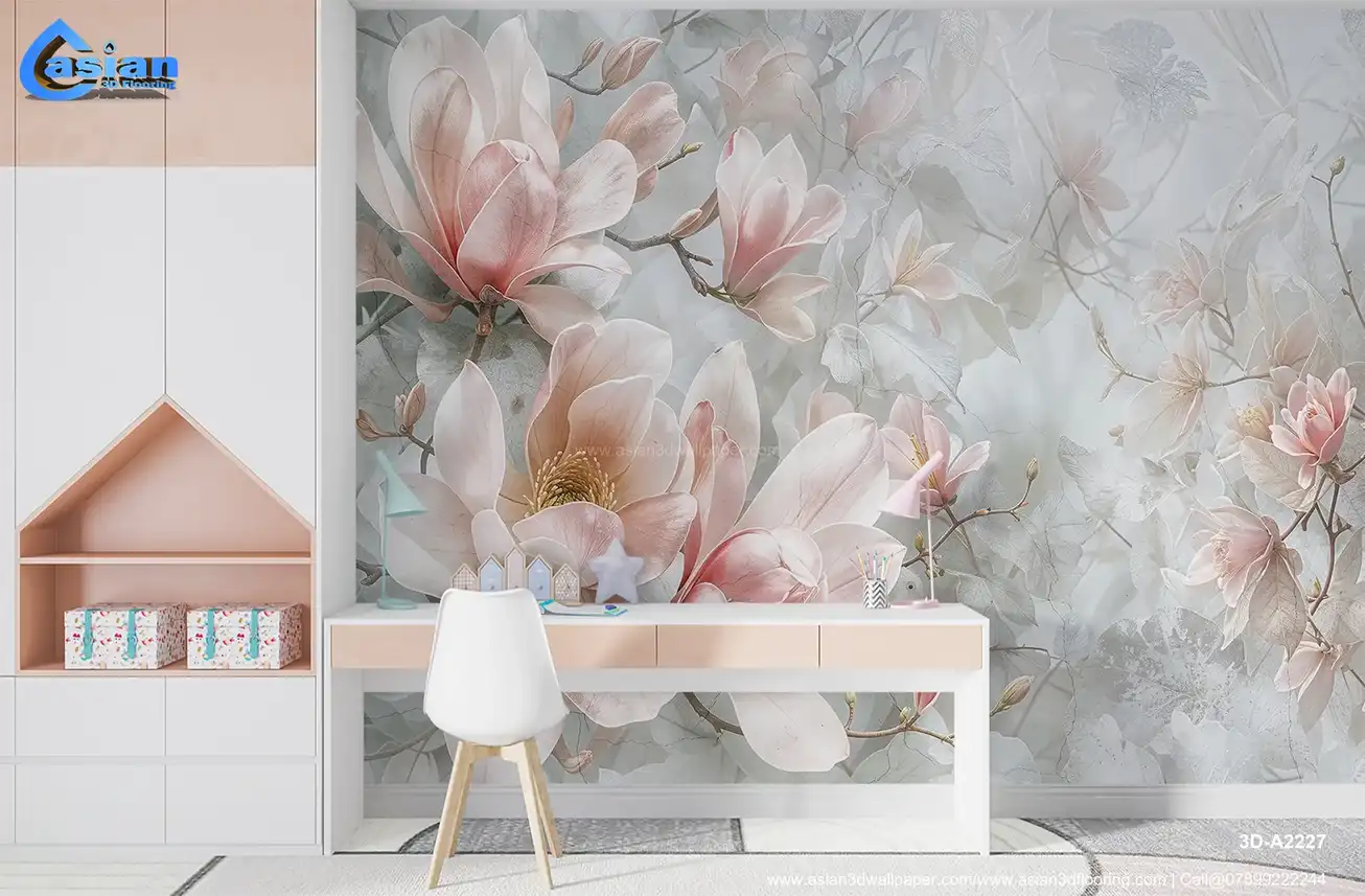 Blushing Magnolia: Soft Pink Floral Wall Mural with Vintage Charm||3D-A2227