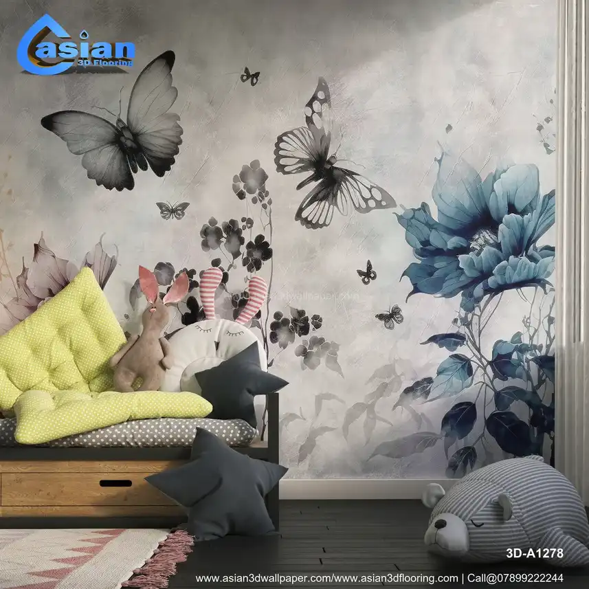 Create a serene and enchanting atmosphere with this butterfly and flower wallpaper design. Featuring delicate butterflies fluttering around soft blue and black flowers, this wallpaper captures the elegance of nature with a dreamy and artistic touch. The subtle gradients of blues and blacks create a calming vibe, making it perfect for bedrooms, living rooms, or any space that benefits from a peaceful yet captivating ambiance. The fine details and soft pastel tones add a sophisticated and modern touch to any room. Benefits:- This wallpaper combines delicate butterflies and soft flowers to create a peaceful, nature-inspired design perfect for any modern or vintage-styled room.