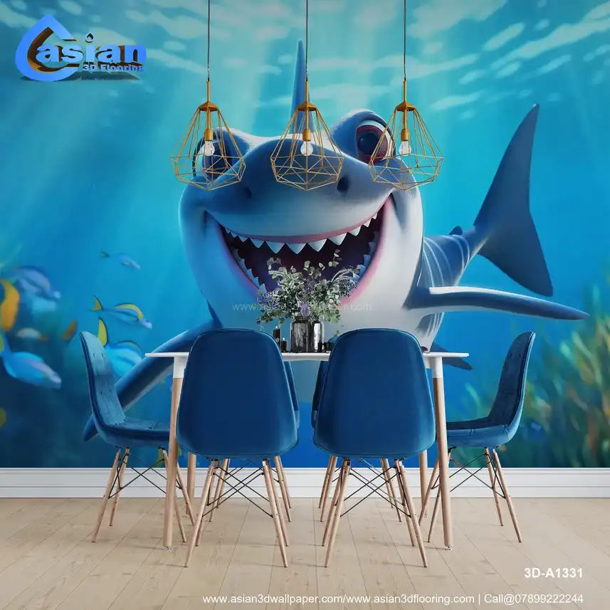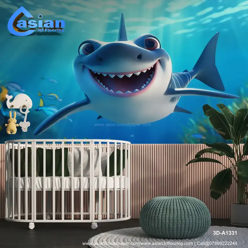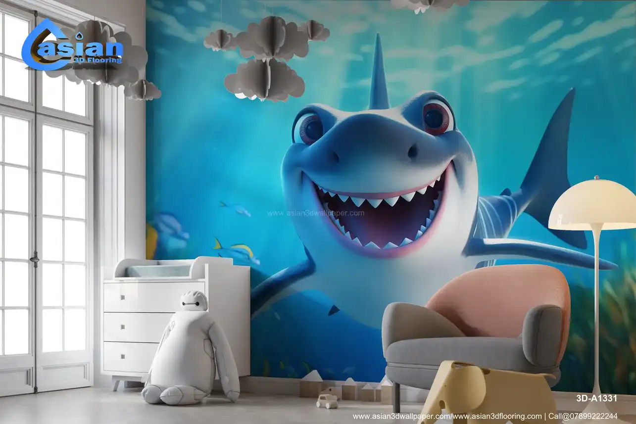 This playful cartoon shark smiles widely as it swims through an ocean filled with colorful fish and vibrant marine plants. Perfect for creating a joyful, whimsical underwater scene, this design brings life and cheer to any space. Benefits:- Engaging and whimsical design for children's rooms, bringing a playful, underwater theme with a happy shark and vibrant ocean creatures to brighten up any space.