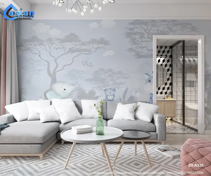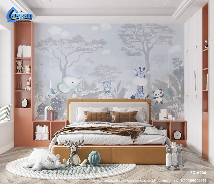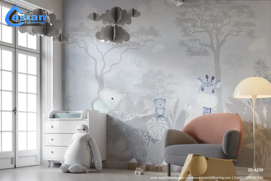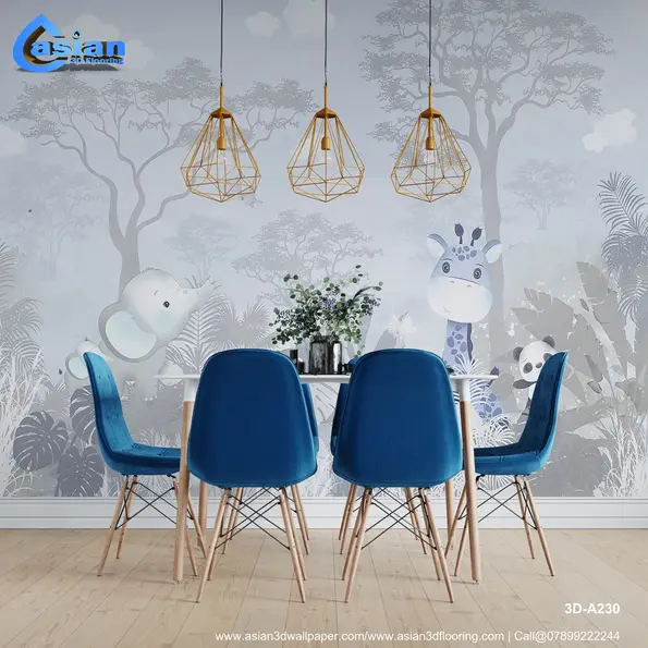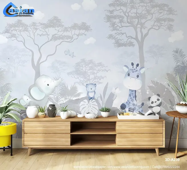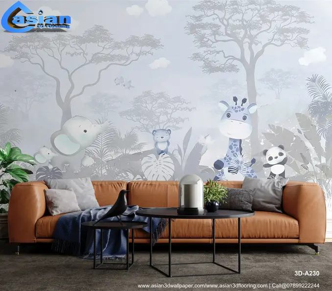 This charming 3D wallpaper in soft blue hues creates a cool, calming atmosphere in any child's room. Featuring adorable elephants, giraffes, pandas, and other safari animals, it brings the beauty of nature to life in a playful way. The gentle colors and whimsical design make it ideal for nurseries, playrooms, or any creative space. Perfect for encouraging imagination and creating a cozy, adventurous environment for young explorers. Product Benefits :- Creates a soothing and playful atmosphere for children's rooms, perfect for sparking imagination.