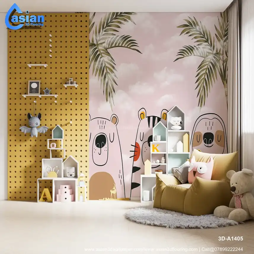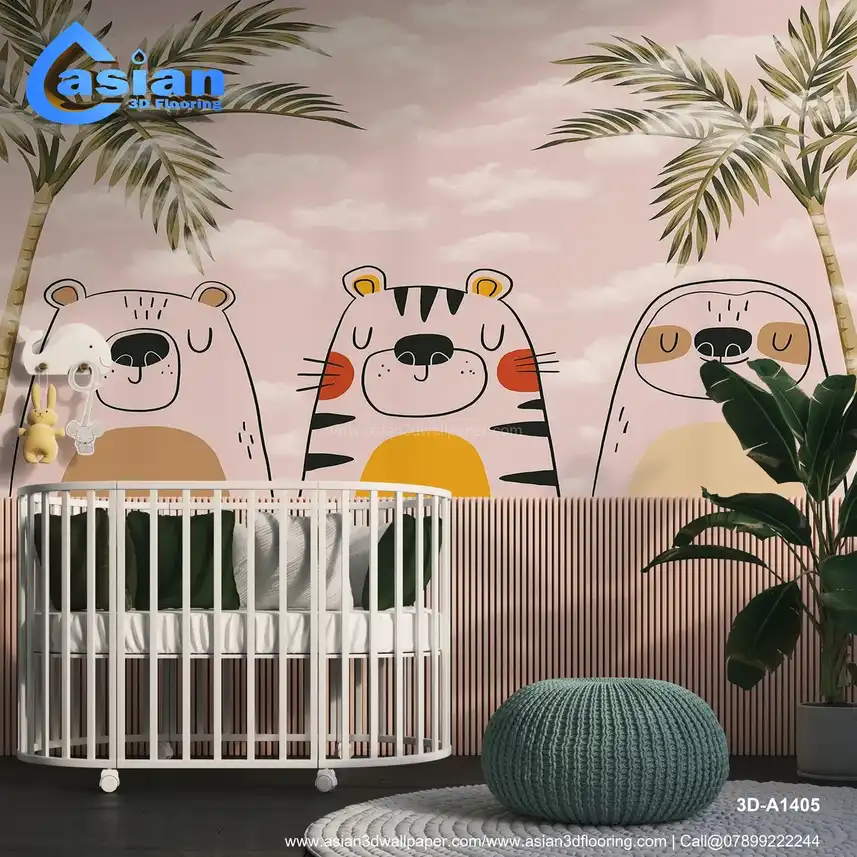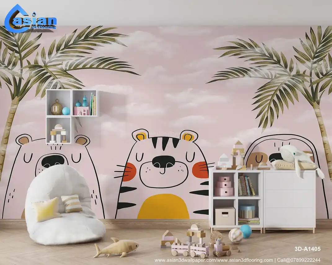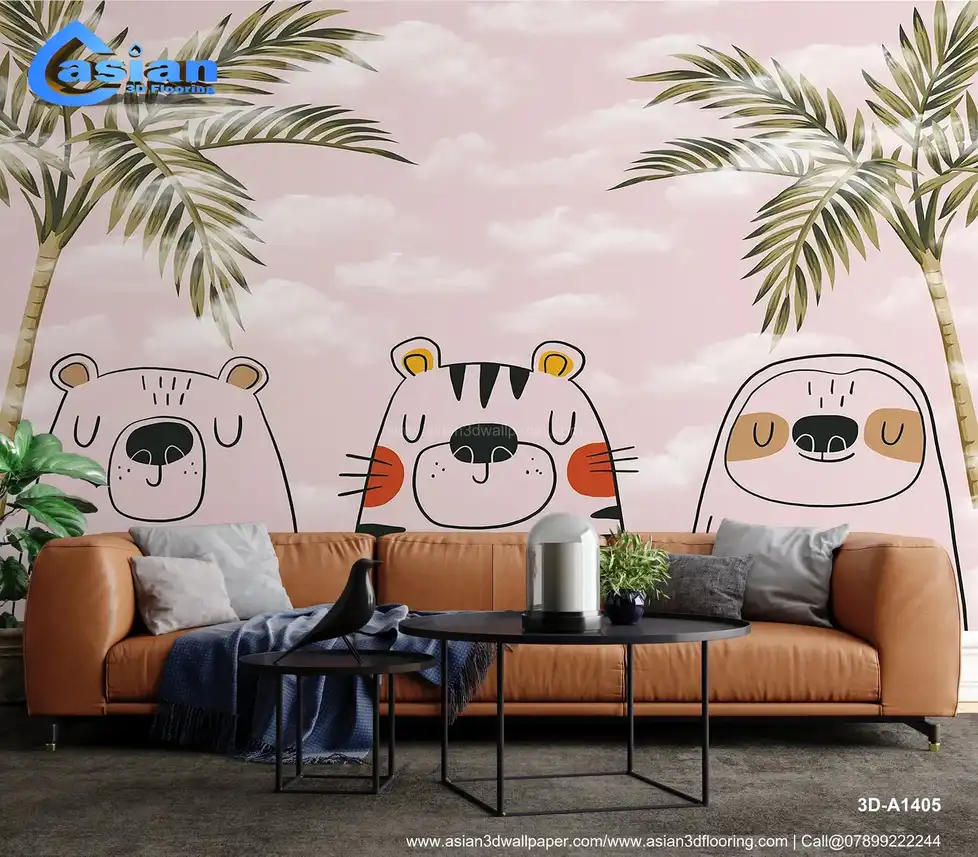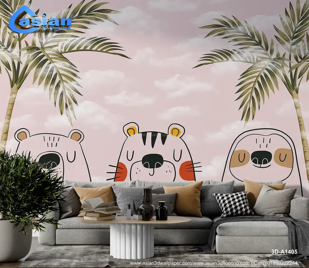 This charming kids' wallpaper features adorable animal friends?a bear, tiger, and sloth?set against a soft pink sky with palm trees and clouds. Its playful design makes it a perfect fit for any nursery or children's bedroom, providing a fun, calming atmosphere. Benefits:- Perfect for creating a playful and calm space for kids, this wallpaper brings together fun animal characters and a tropical jungle theme.