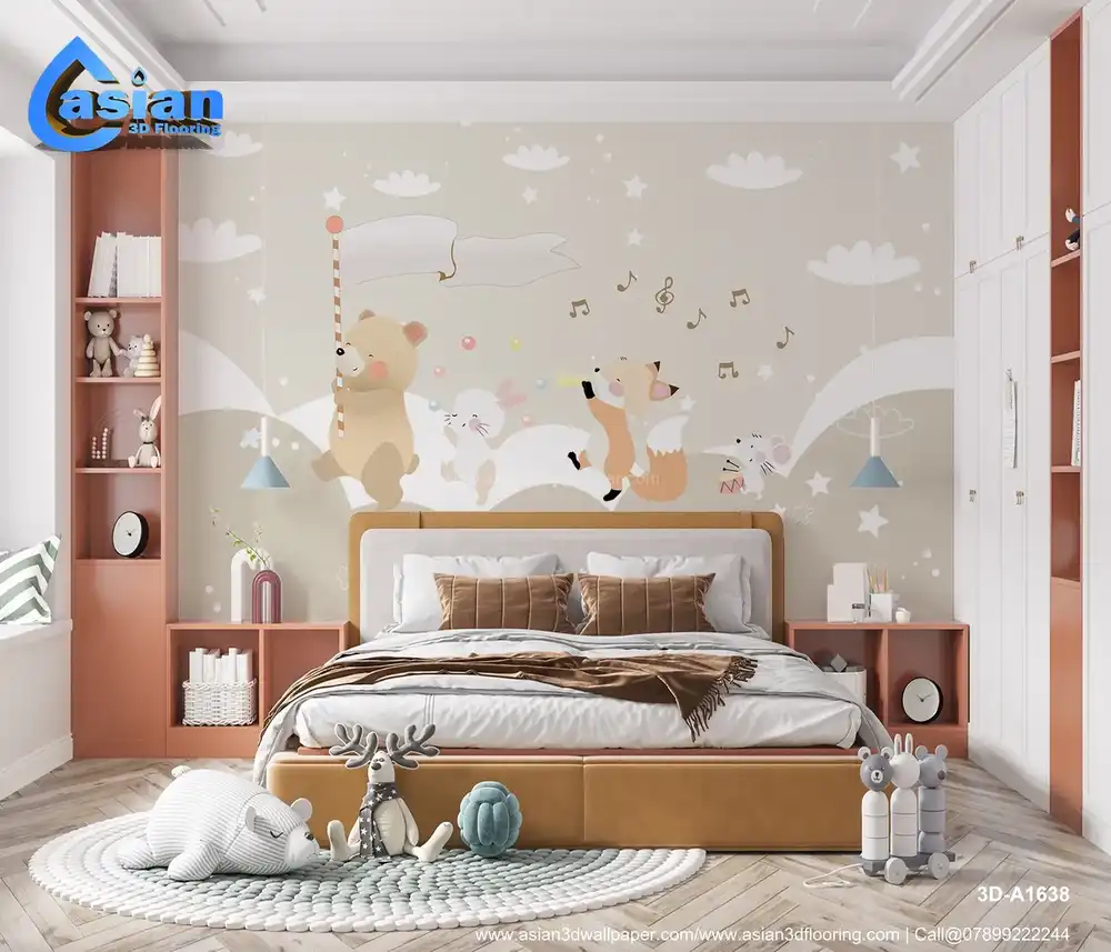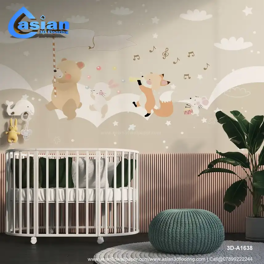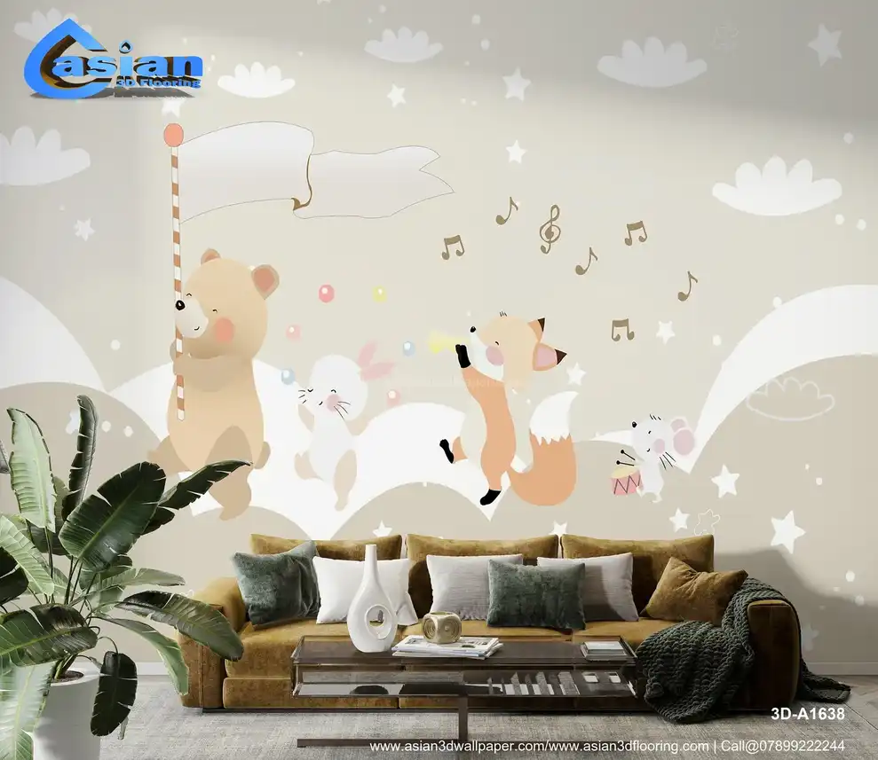 This charming wallpaper features a bear, bunny, fox, and mouse marching with a musical parade in a pastel setting. Perfect for a child's room, nursery, or play area, it brings fun and whimsy to any space. Benefits:- Ideal for creating a playful, lighthearted atmosphere in kids' spaces with adorable animals and soothing colors.