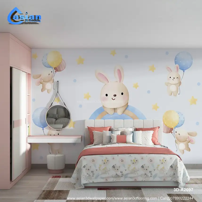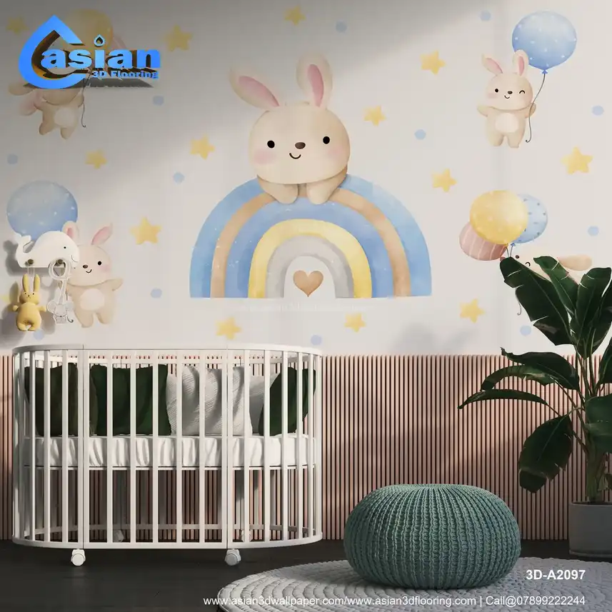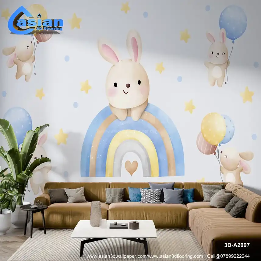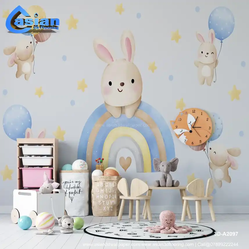 Cute Bunnies with Rainbow & Balloons - Children's Nursery Wallpaper||3D-A2097