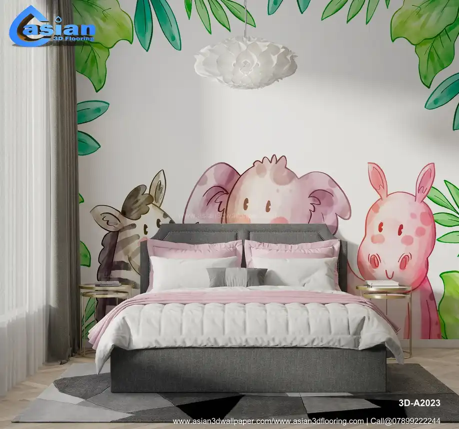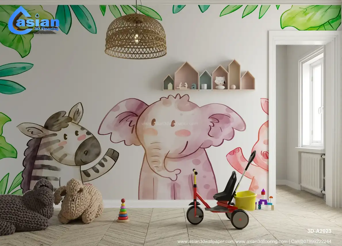 This playful cartoon wallpaper features a zebra, elephant, and pig surrounded by green foliage. Perfect for adding a fun and cheerful vibe to a child's room or nursery. Benefits:- Ideal for creating a bright and happy space in your child?s room, this wallpaper features endearing animals and nature elements.