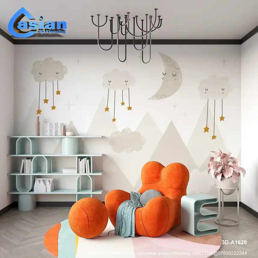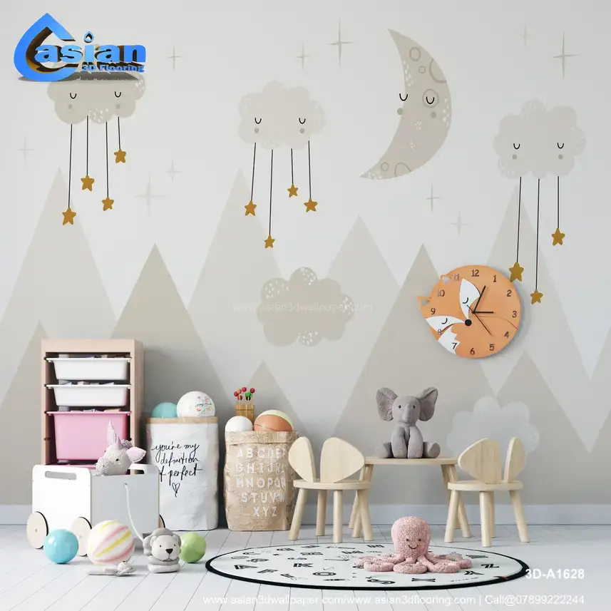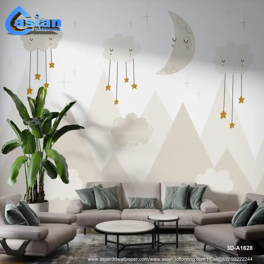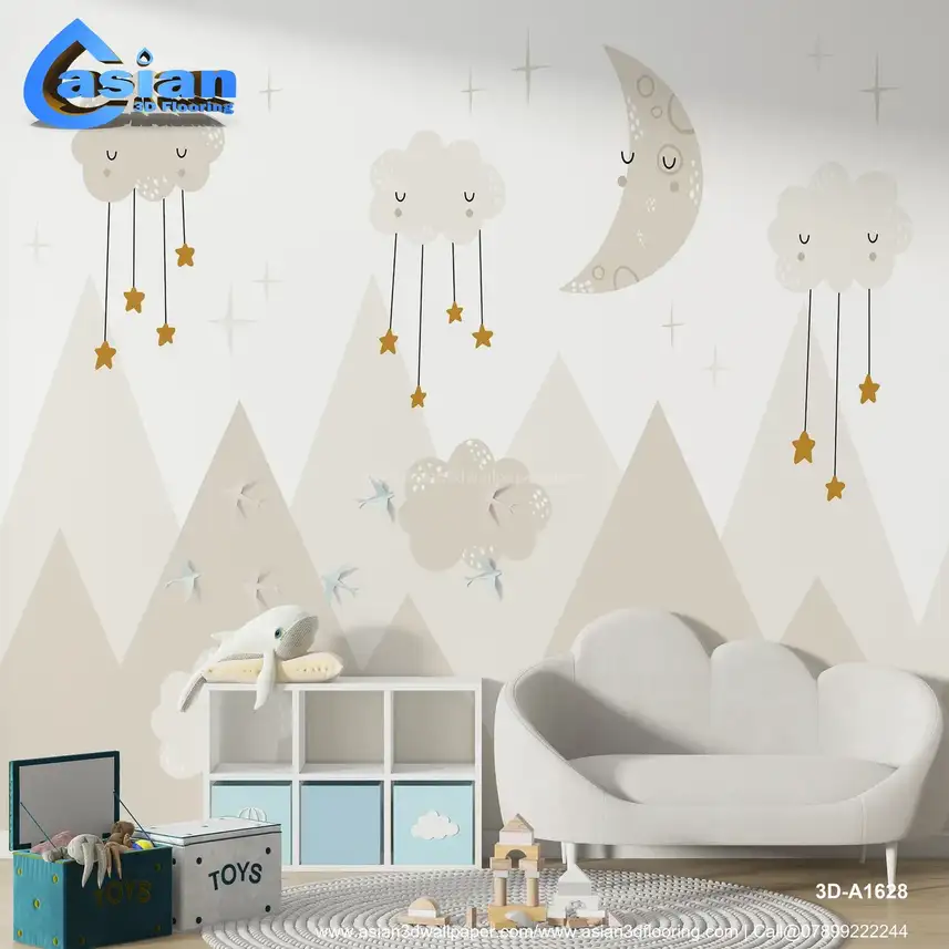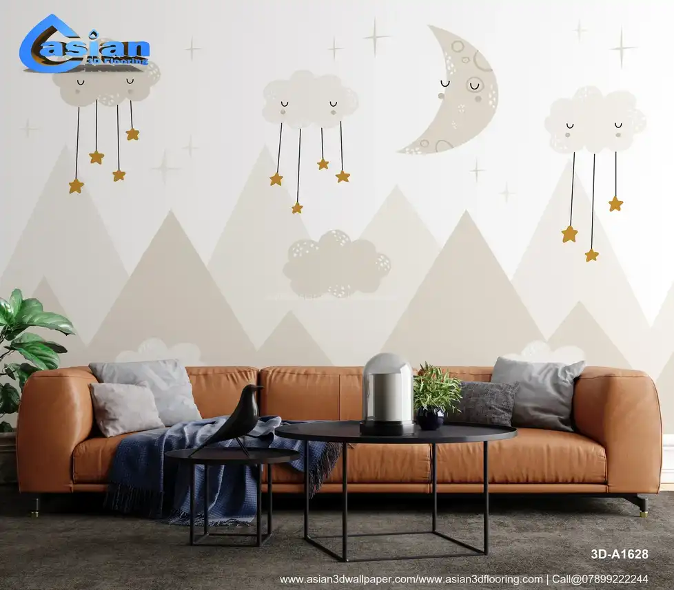 This charming wallpaper features soft clouds with hanging stars and a crescent moon over serene mountains. Ideal for children?s rooms, nurseries, or bedrooms, it creates a dreamy atmosphere perfect for rest and relaxation. The gentle colors of cream and beige add warmth and calm to any space. Benefits:- Perfect for creating a peaceful, dreamy atmosphere in nurseries or bedrooms.