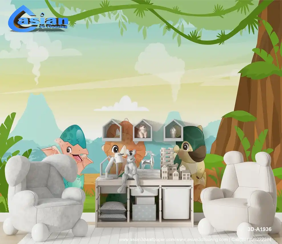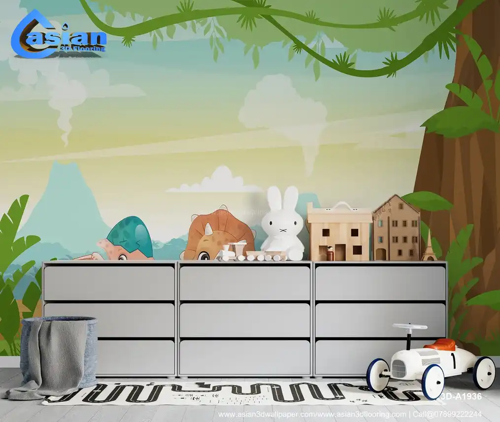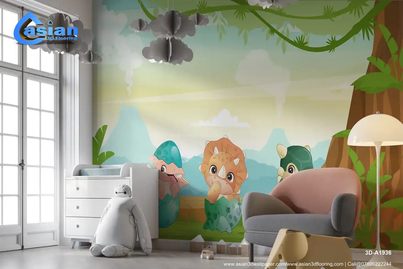 This charming wallpaper features adorable dinosaur hatchlings emerging from their eggs in a lush Jurassic jungle. The vibrant colors and playful characters make it an ideal choice for children's rooms, nurseries, or any space that needs a fun, imaginative touch. Featuring soft pastel hues and a friendly, cartoonish design, it?s perfect for creating a whimsical, dino-themed atmosphere for little ones. Benefits:- Bring the fun and excitement of dinosaurs into your child's room with this vibrant and cute dinosaur hatchlings wallpaper. Perfect for any dino lover, it creates a lively and playful environment.