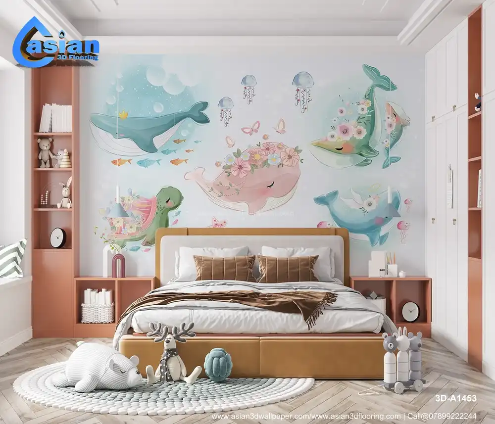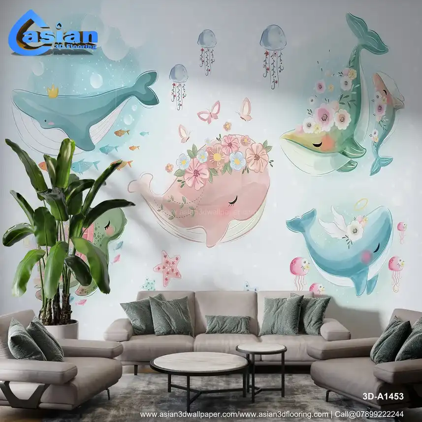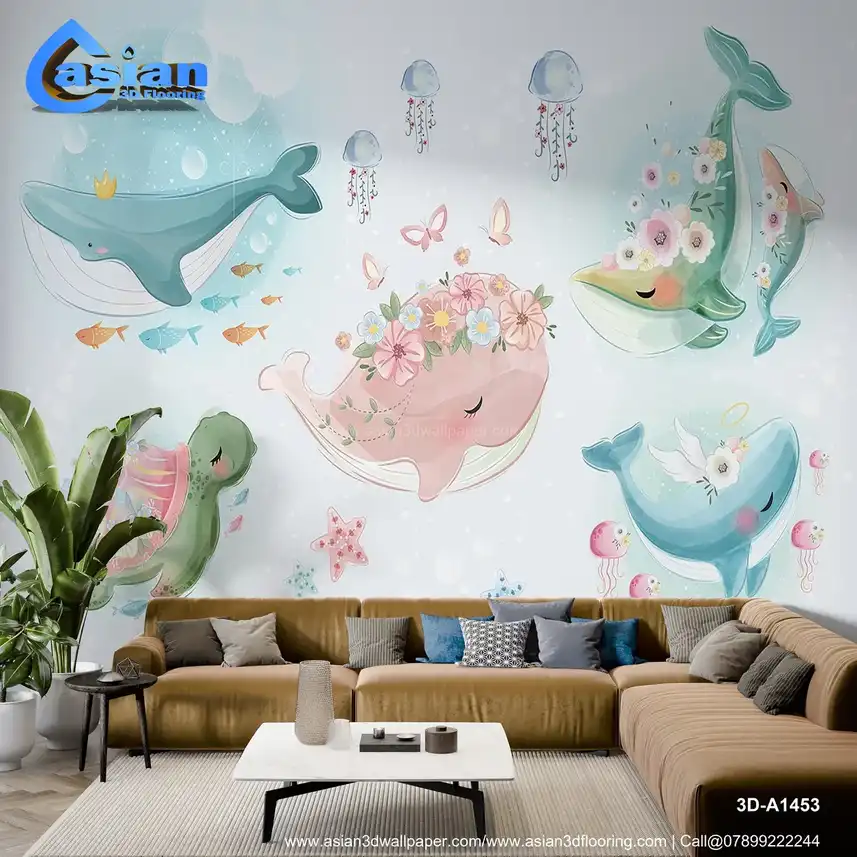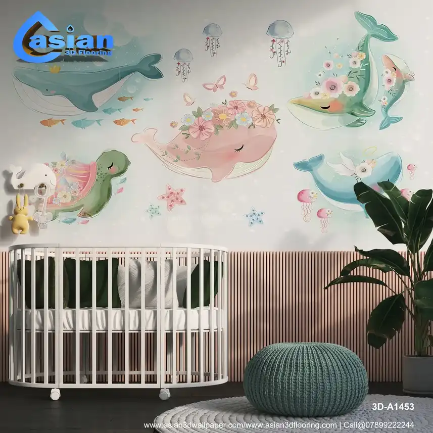 This adorable underwater wallpaper features playful whales, a turtle, jellyfish, and fish all surrounded by pastel flowers, soft bubbles, and a dreamy ocean backdrop. The whimsical, pastel colors of pink, blue, and green make it a perfect design for kids' rooms, nurseries, or play areas. Benefits:- Inspires joy and creativity with its cute and playful ocean theme, perfect for creating a lively, fun atmosphere in kids' spaces.