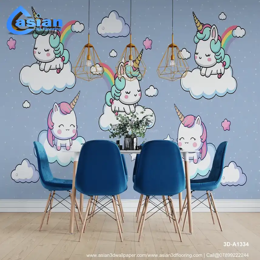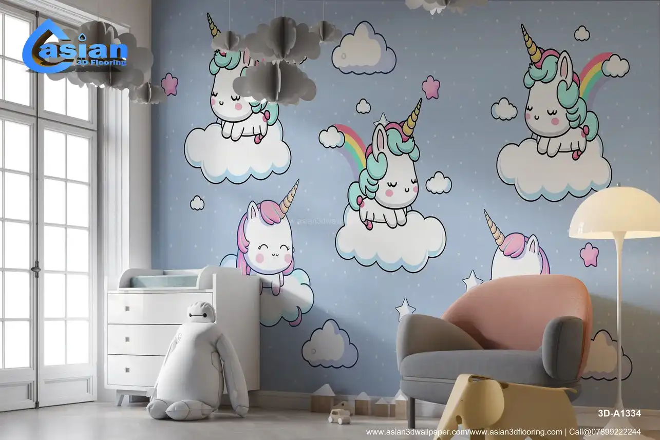 This adorable wallpaper features multiple unicorns floating on clouds with rainbows, stars, and soft pastel colors. Perfect for creating a magical, dreamy atmosphere in children's bedrooms or nurseries. Benefits:- A playful and whimsical design featuring cute unicorns, rainbows, and stars to bring a magical touch to any child's room.