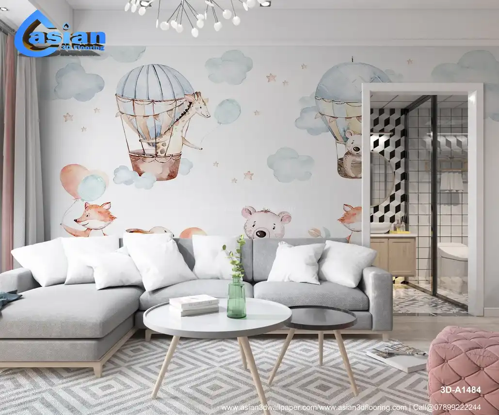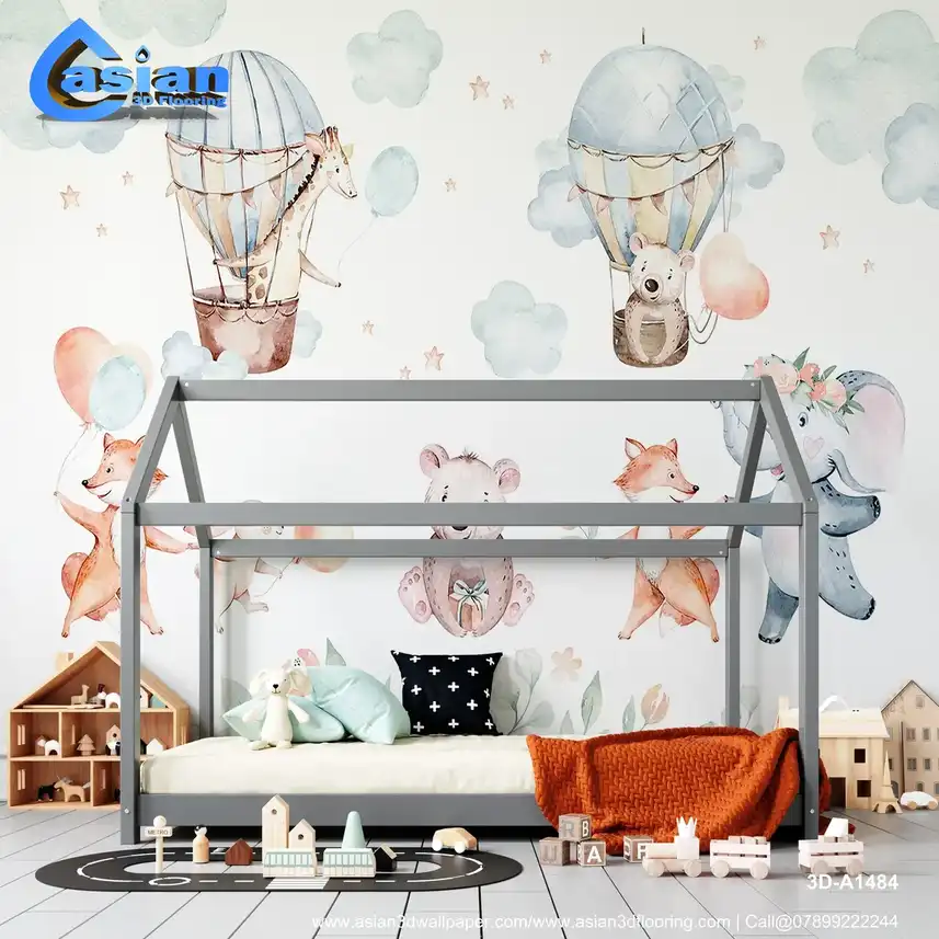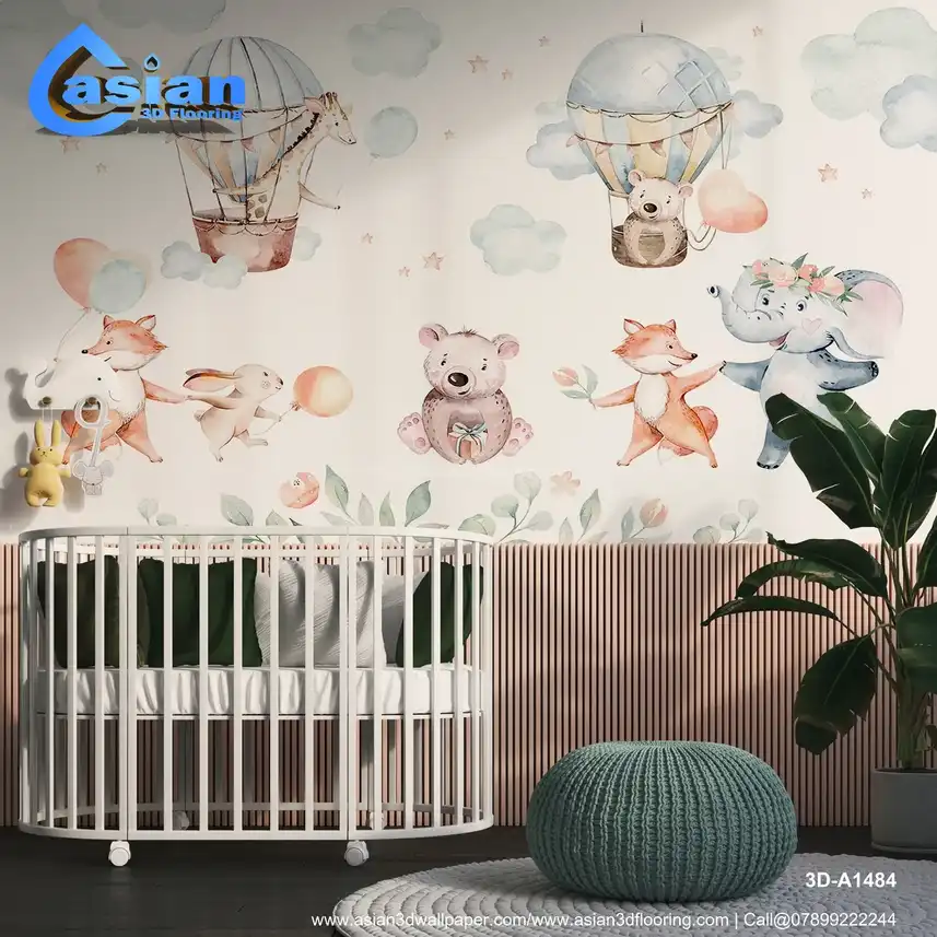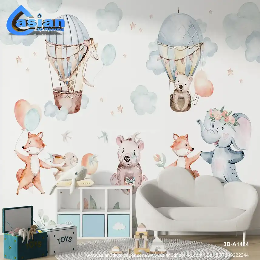 This delightful watercolor wallpaper features a charming mix of animals, including a giraffe, elephant, fox, bear, and bunny, each holding colorful balloons or enjoying a hot air balloon ride. The soft, pastel colors and playful animals make this wallpaper perfect for children's rooms, nurseries, or play areas. Benefits:- Bring joy and color to any children's room with this adorable watercolor animal wallpaper, featuring playful animals and hot air balloons.