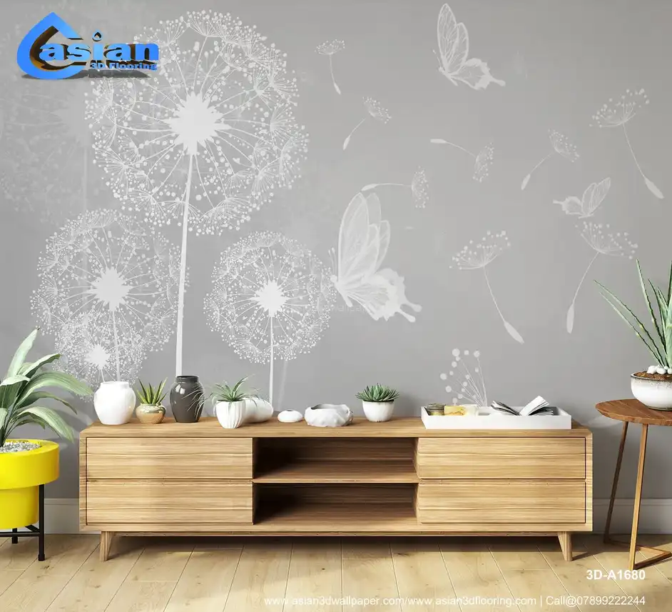 Dandelion and Butterfly Wallpaper in Grey Tones||3D-A1680
