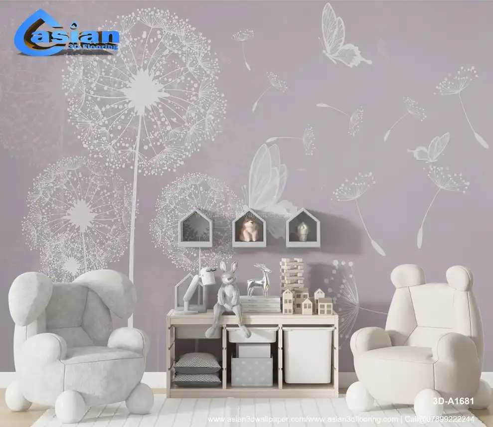 Dandelion and Butterfly Wallpaper in Light Purple||3D-A1681
