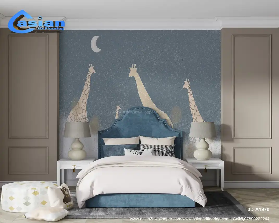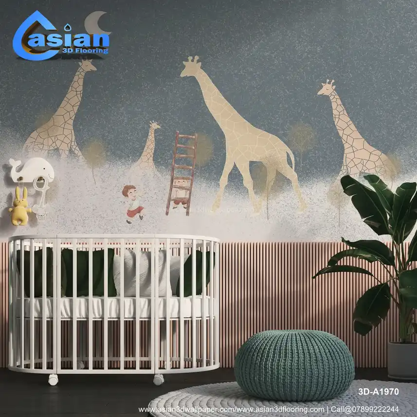 This enchanting wallpaper design features a dreamy scene of giraffes under the moonlight, with children reaching for the stars. Perfect for creating a magical atmosphere in children's rooms, nurseries, or play areas. The soft, pastel hues inspire creativity and joy. Benefits:- This playful wallpaper design brings a sense of wonder to kids' rooms with giraffes, a ladder, and a dreamy atmosphere that sparks imagination.