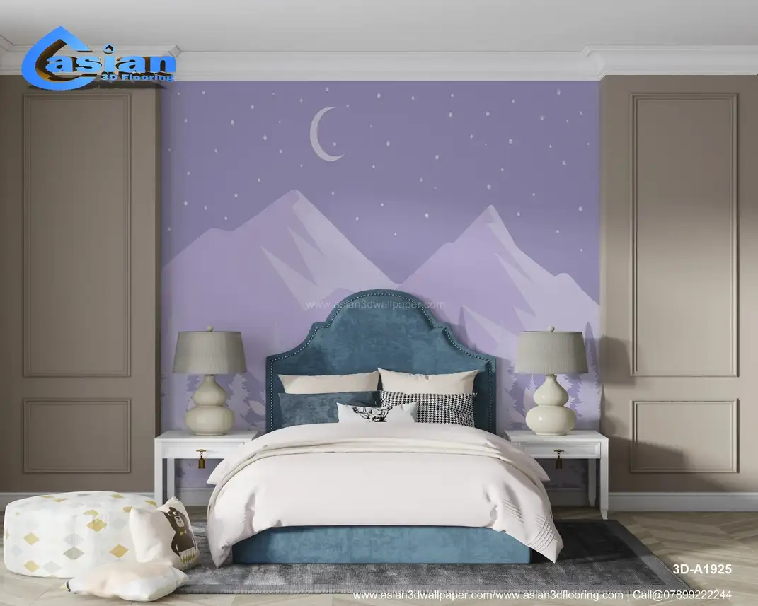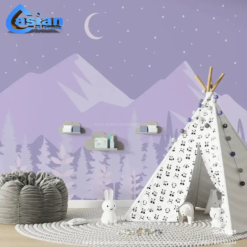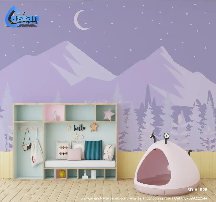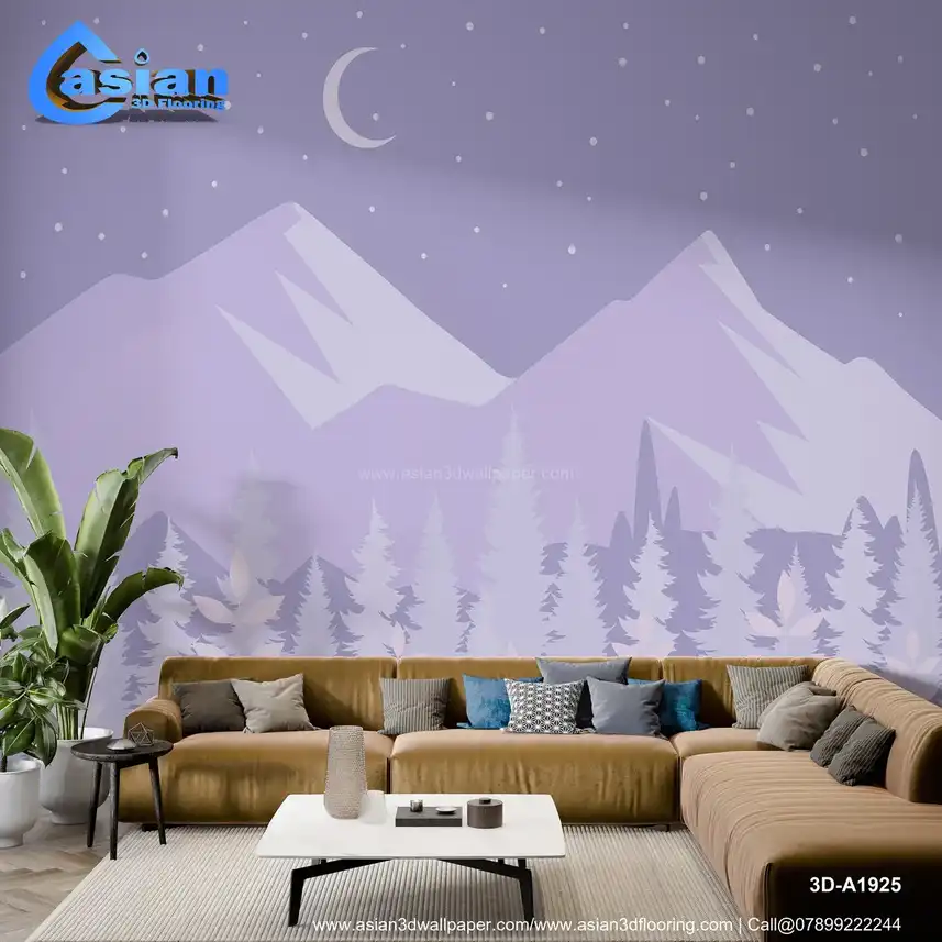 This serene wallpaper showcases soft purple mountains, trees, and a crescent moon under a starry sky. The dreamy purple tones and nature-inspired elements create a peaceful, tranquil atmosphere, ideal for bedrooms, living rooms, or spaces that need a calm, comforting touch. Benefits:- Perfect for creating a calming, serene atmosphere in bedrooms, living rooms, or any room looking for a peaceful, nature-inspired touch.