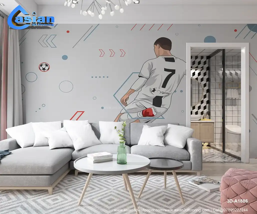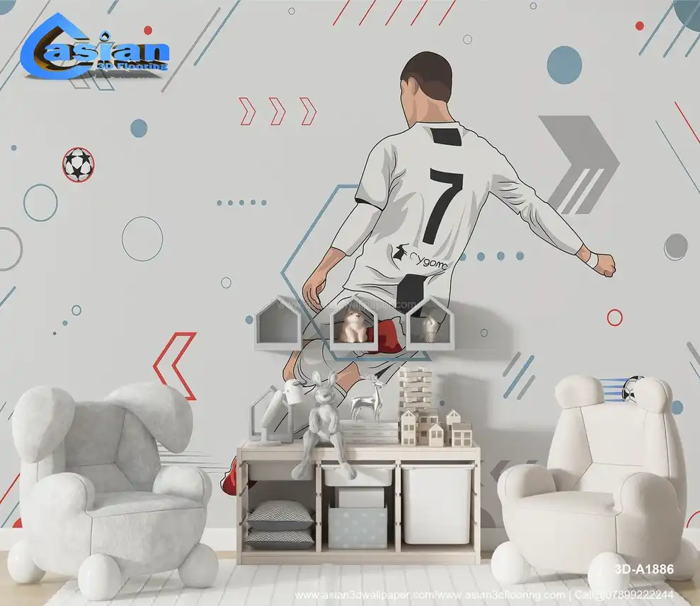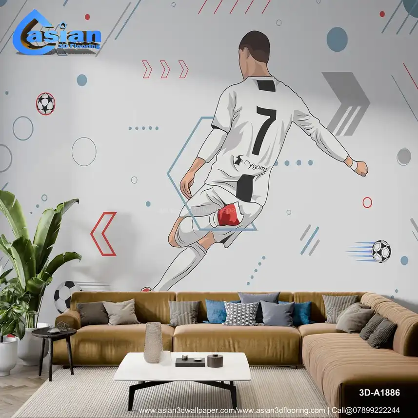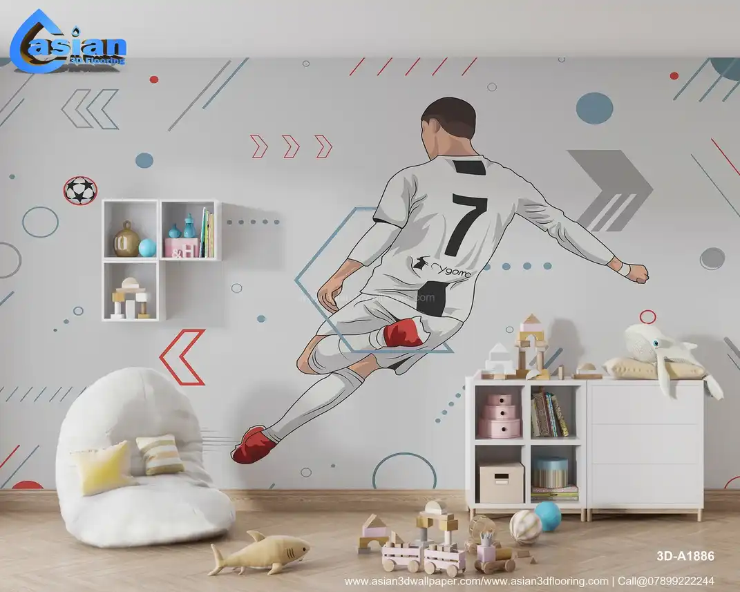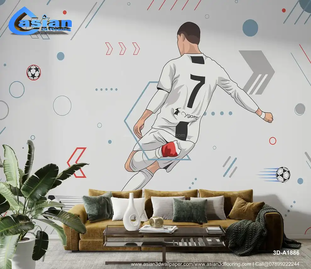 This vibrant illustration captures the motion of a soccer player in action, showcasing a kick with dynamic lines and geometric shapes in the background. Benefits:- Energize your space with this action-packed soccer player illustration, perfect for sports enthusiasts and modern interiors.