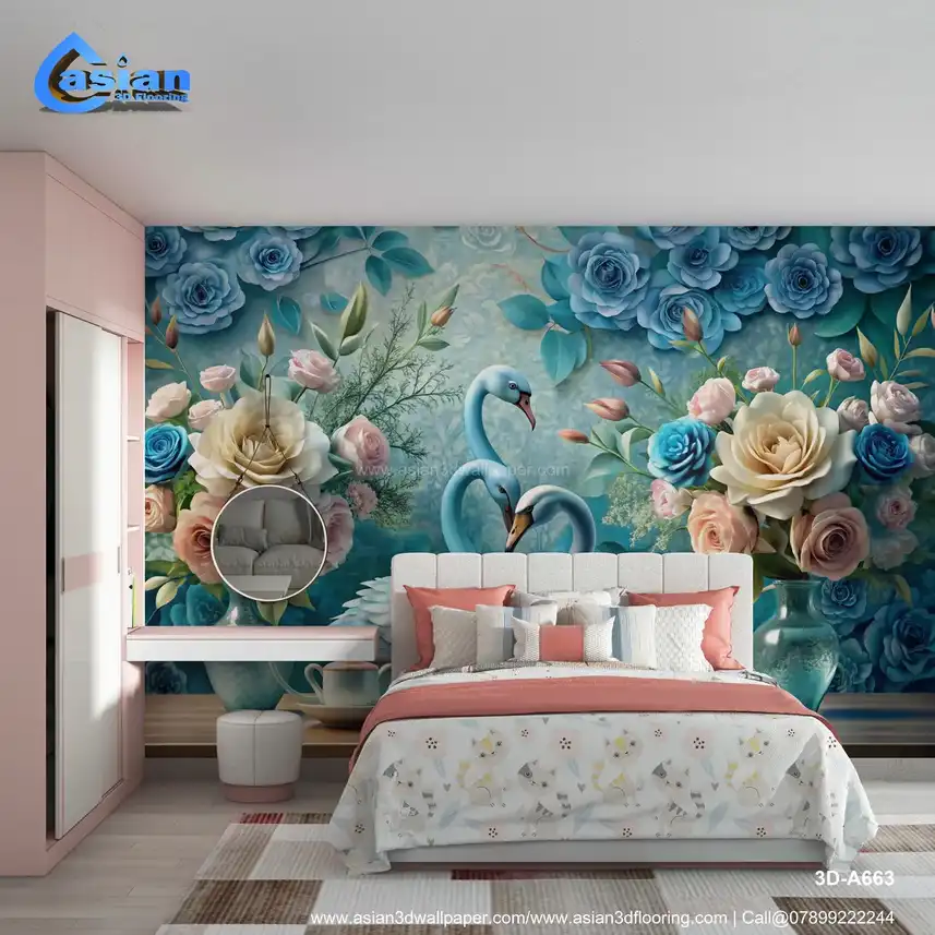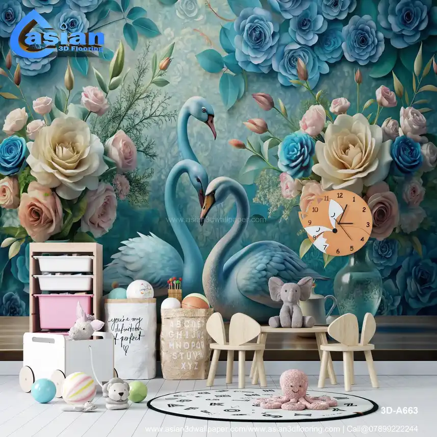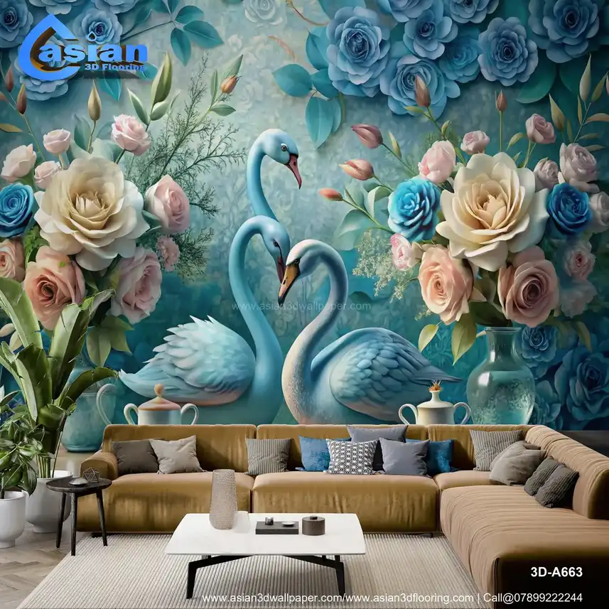 This stunning image presents a beautiful 3D design featuring two elegant swans amidst a vibrant floral arrangement. The intricate details of the swans and the soft hues of the flowers create a serene and romantic atmosphere. Perfect for enhancing interior decor in homes, cafes, or event spaces, this design captures the beauty of nature and artistry. Ideal for those looking to add a touch of elegance and charm to their surroundings, making it a versatile choice for various interior styles. Benefits:- Adds elegance and charm to any interior, ideal for creating a serene atmosphere, complements various decor themes