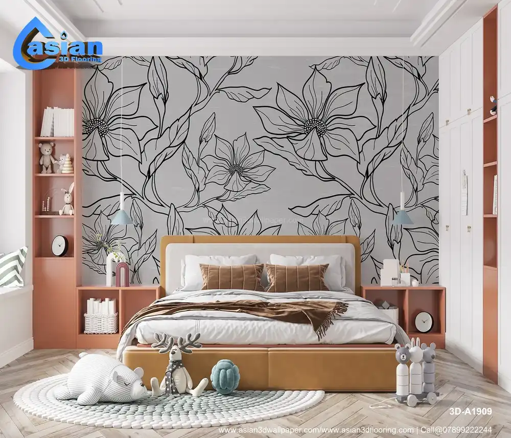 This elegant black and white floral wallpaper features intricate line art of flowers and leaves on a soft grey background. Its minimalist design adds a touch of sophistication and serenity to modern interiors, perfect for creating a calming and stylish atmosphere. Benefits:- Adds a modern and sophisticated touch to bedrooms, living rooms, or any space requiring a calming, stylish atmosphere. Ideal for contemporary interiors.