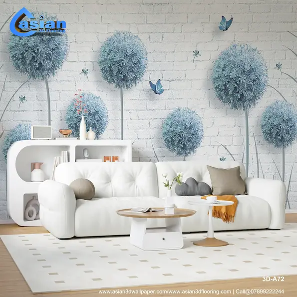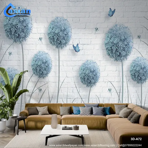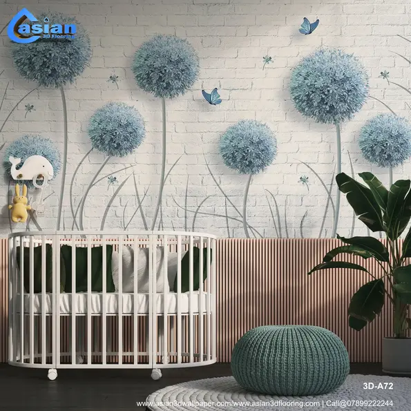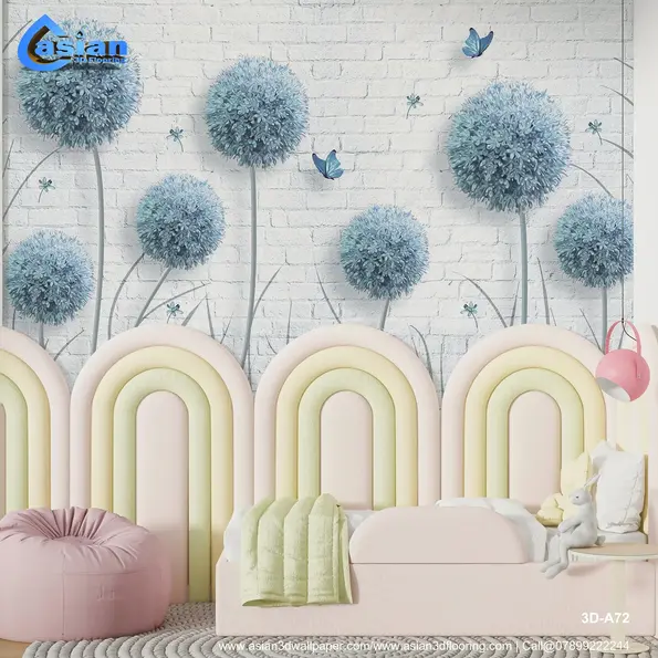 Transform your walls with this serene wallpaper featuring delicate blue dandelion-style flowers and fluttering butterflies set against a subtle white brick background. Perfect for bedrooms, living spaces, or nurseries, this design brings a peaceful and elegant charm. Product Benefits :- Adds a calming and elegant touch to interiors, perfect for creating a serene ambiance; durable, easy-to-maintain material; ideal for bedrooms, living rooms, and nurseries.