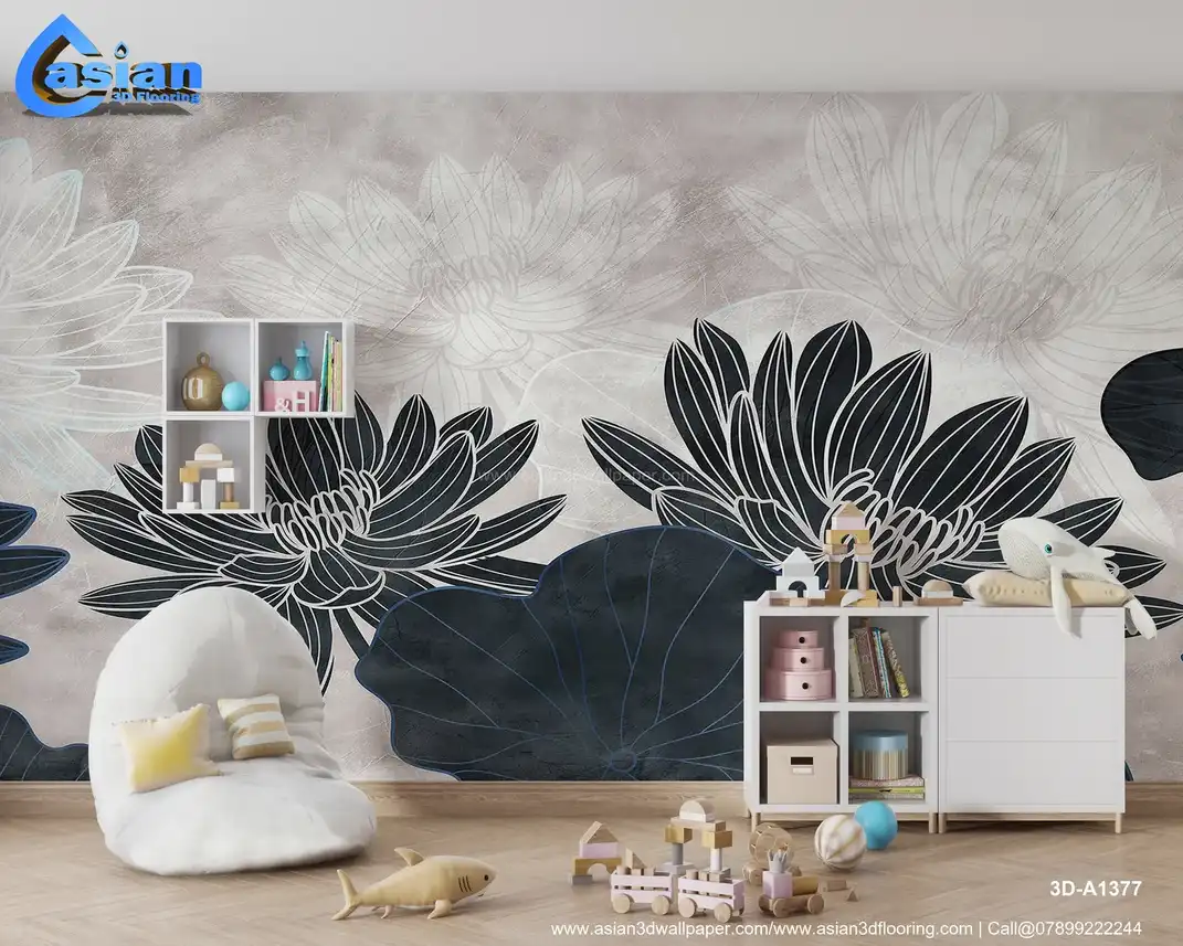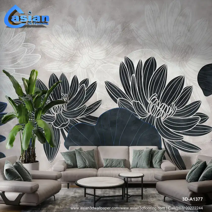 A stunning design featuring dark lotus flowers outlined in delicate white, set against a muted gray background. This wallpaper brings a bold yet serene touch to any modern living space. Benefits:- Ideal for living rooms, bedrooms, and offices, adding depth and elegance with a modern botanical theme.