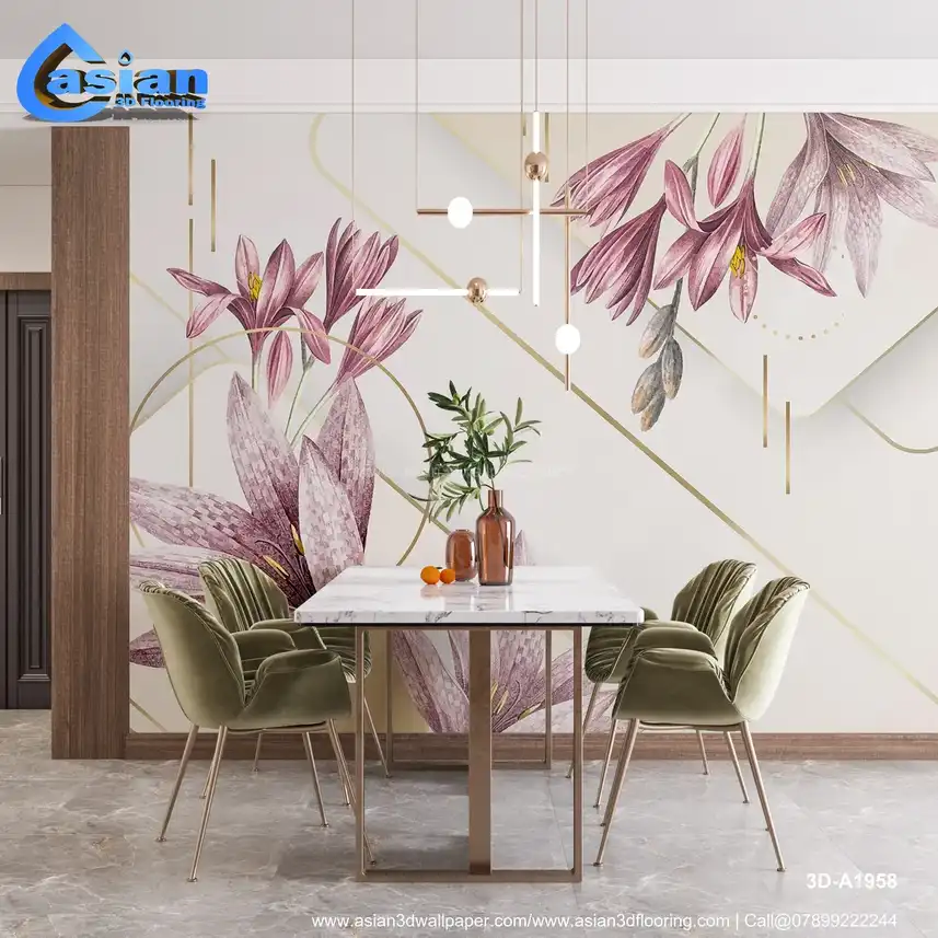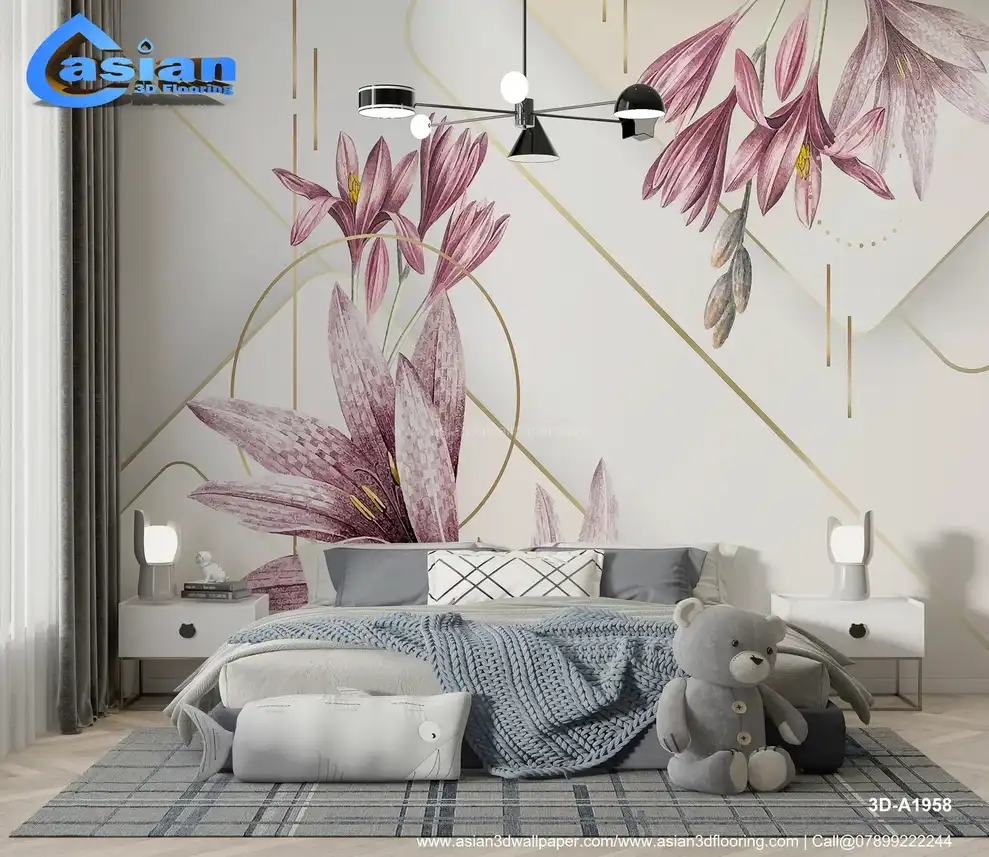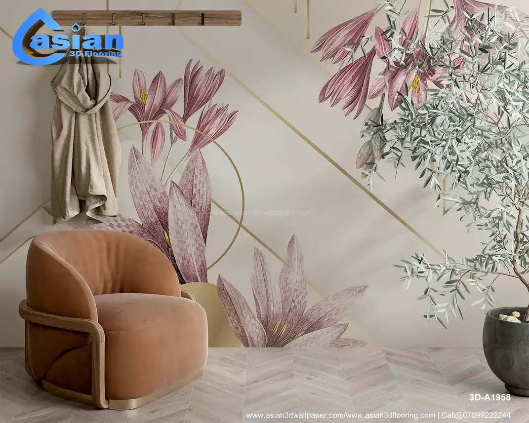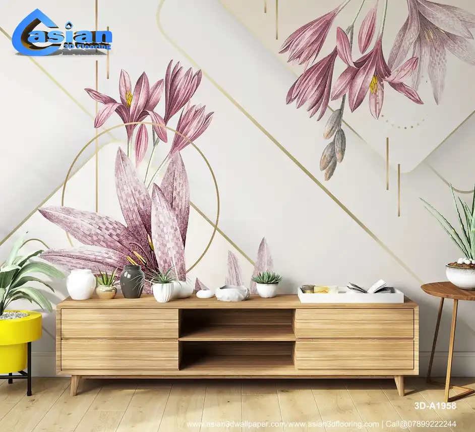 This sophisticated wallpaper features elegant lilies in soft, muted pink tones with delicate golden accents. The geometric lines and circular elements add a modern touch, enhancing the beauty of the floral pattern. The subtle background provides a refined canvas for the floral design, creating a harmonious blend of nature and modernism. Ideal for contemporary living rooms, bedrooms, and elegant spaces looking for a luxurious, floral yet modern atmosphere. Benefits:- This elegant floral wallpaper features soft pink lilies and geometric accents with gold details. Perfect for adding a modern, luxurious touch to any contemporary space.