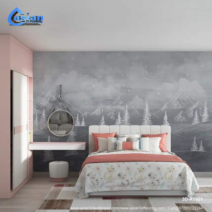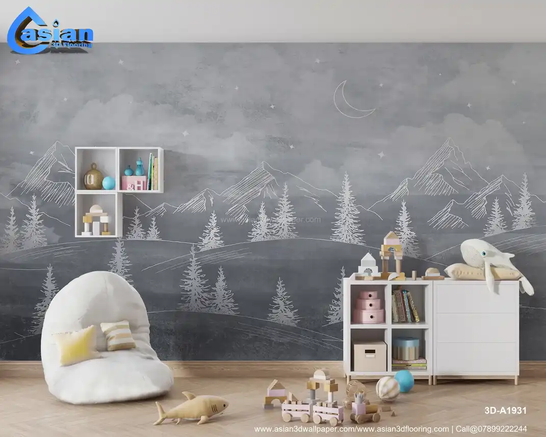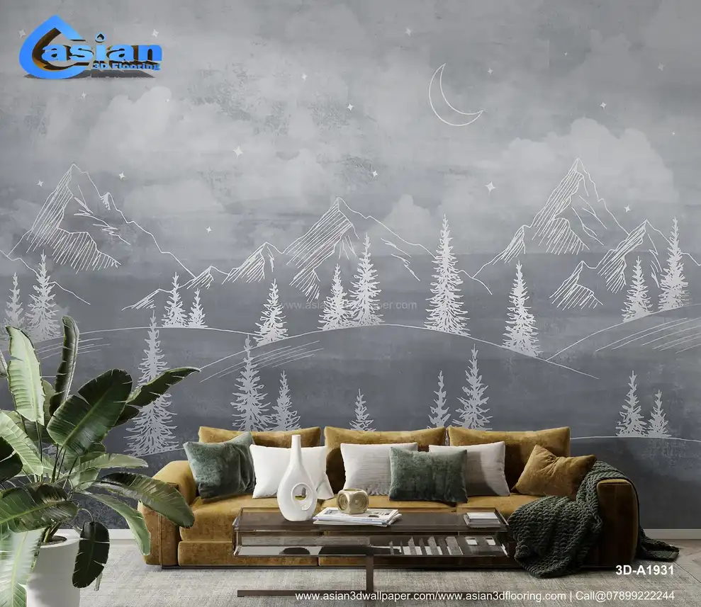 This serene wallpaper features a monochrome landscape with snowy mountains, pine trees, and a crescent moon, creating a peaceful and contemporary atmosphere. Perfect for adding a calming and minimalist touch to bedrooms, living rooms, or any modern interior. Benefits:- Ideal for creating a tranquil, modern atmosphere in living rooms, bedrooms, or any space seeking a peaceful, minimalist design.