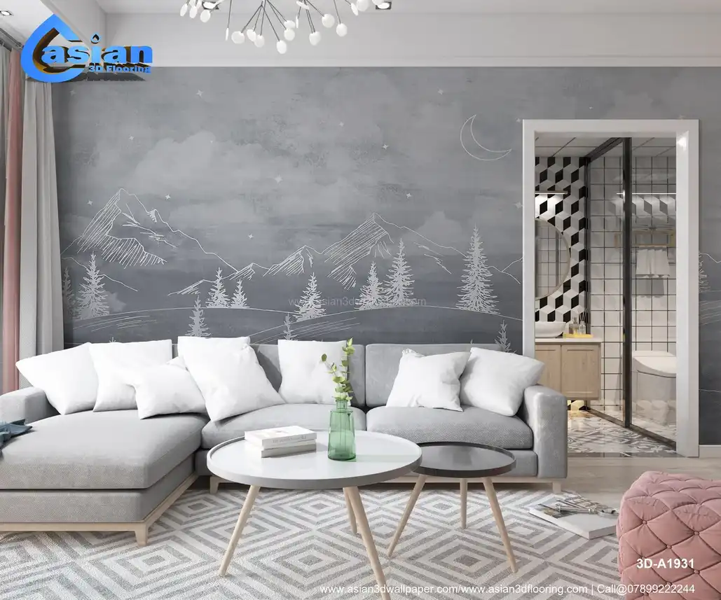 Elegant Grayscale Mountain and Pine Tree Wallpaper for Modern Interiors||3D-A1931