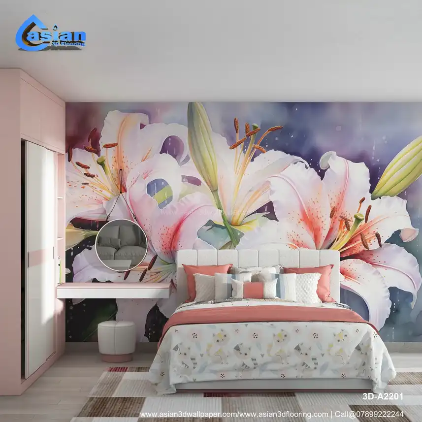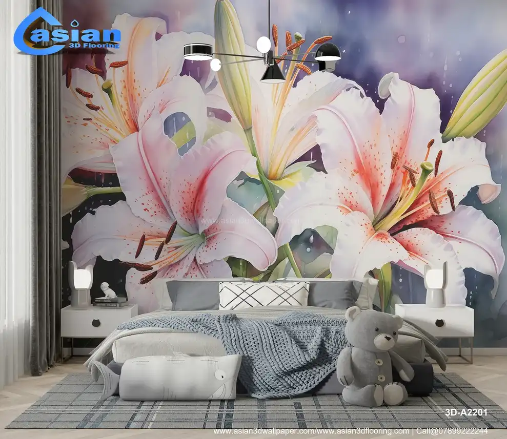 Elegant Lilies: Realistic Floral Wall Mural in Soft Hues||3D-A2201
