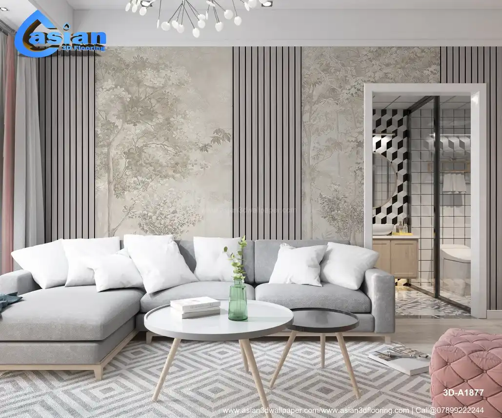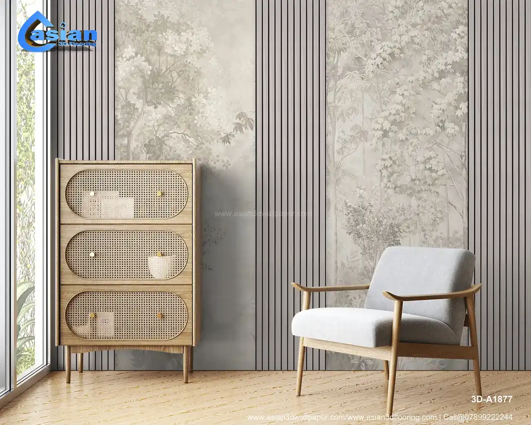 This nature-inspired wallpaper features delicate trees, soft greenery, and a serene atmosphere, complemented by subtle vertical stripes for a modern, elegant look. Perfect for creating a calming space. Benefits:- Bring the serenity of nature indoors with this elegant wallpaper that combines lush trees and soft hues for a peaceful atmosphere.