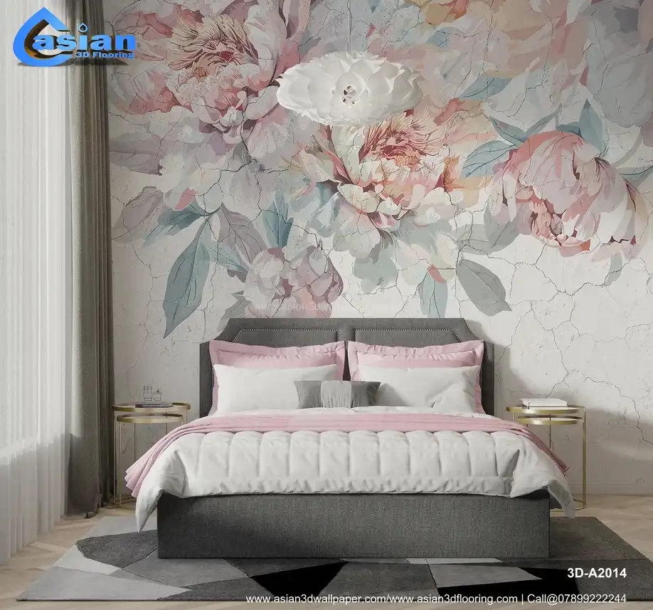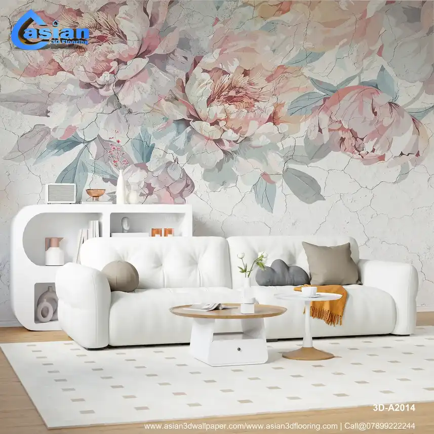 Elegant Peony Floral Wallpaper with Soft Cracked White Background||3D-A2014