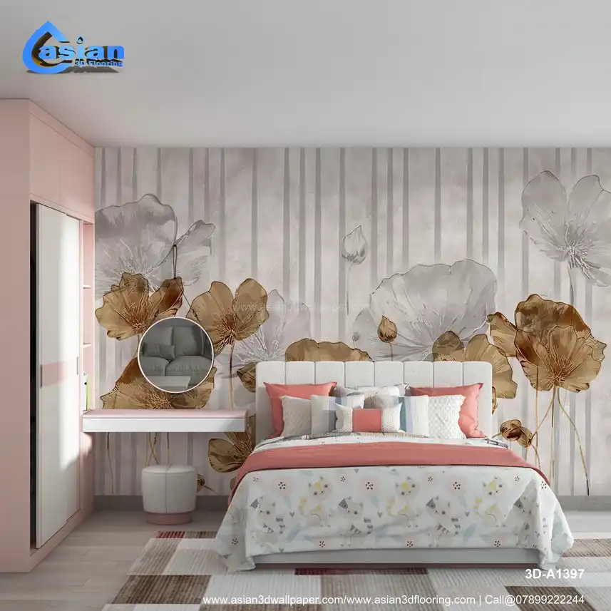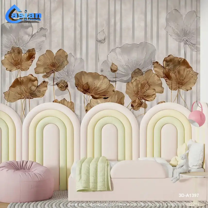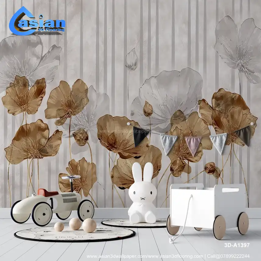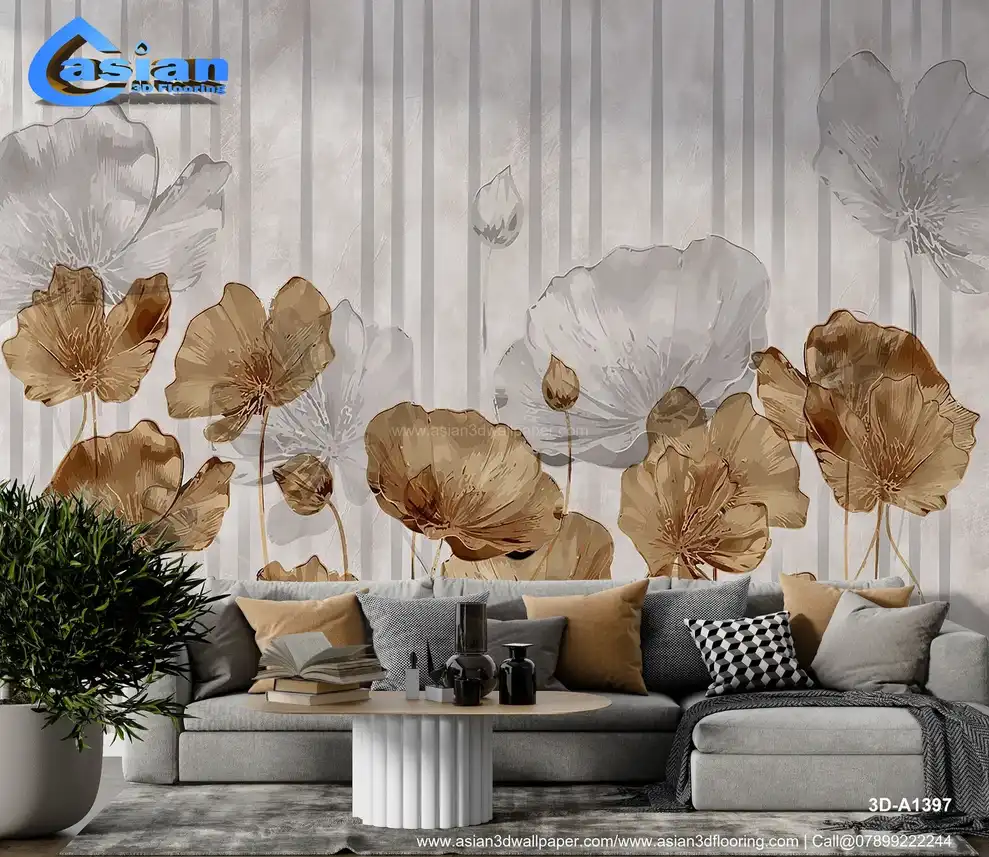 A serene wallpaper featuring poppy flowers in soft beige and white hues, set against a minimal striped background. Benefits:- Perfect for creating a calm, sophisticated environment with a modern touch of floral elegance.