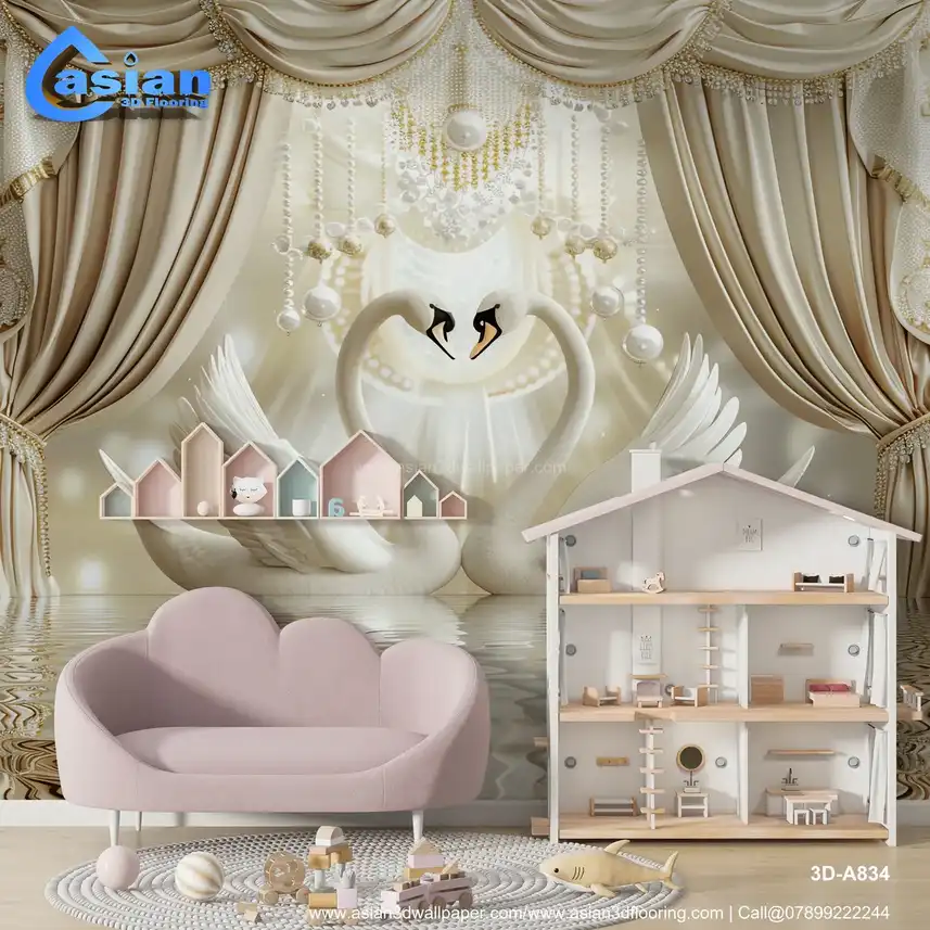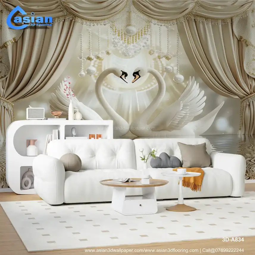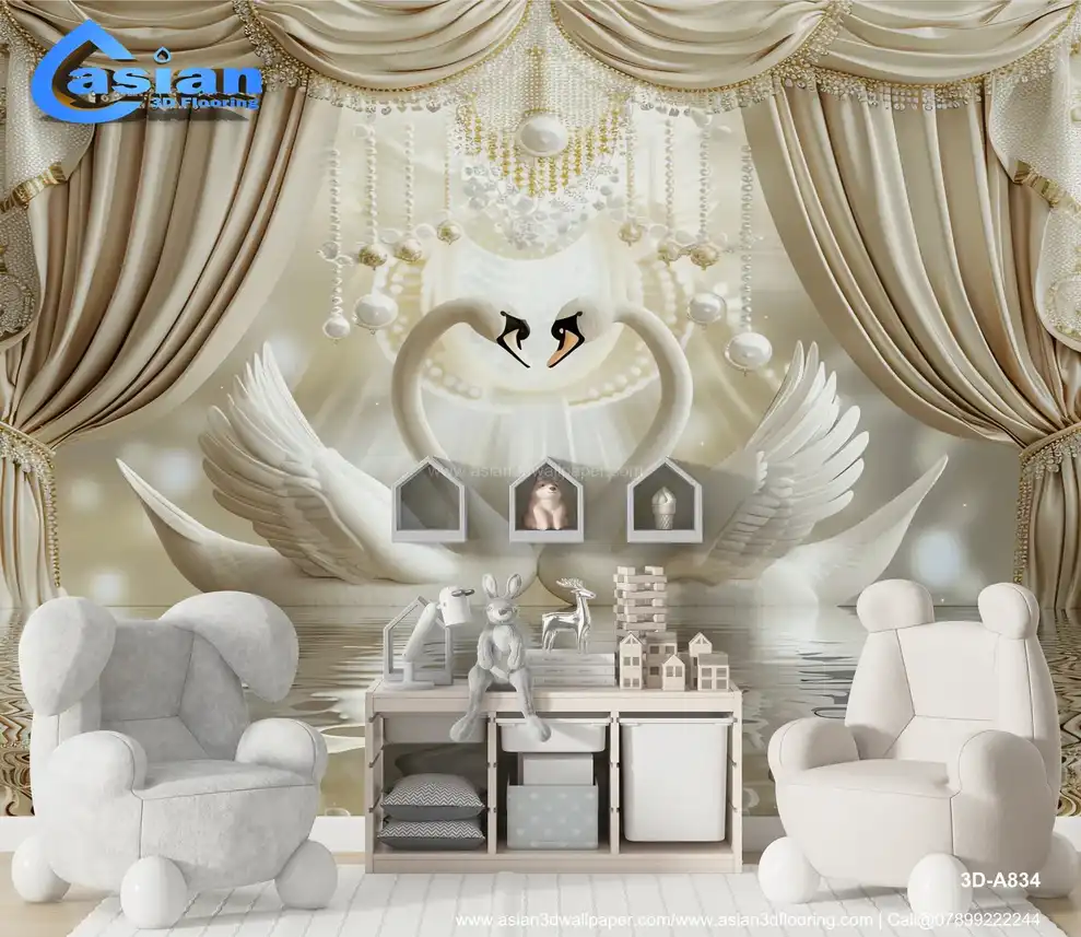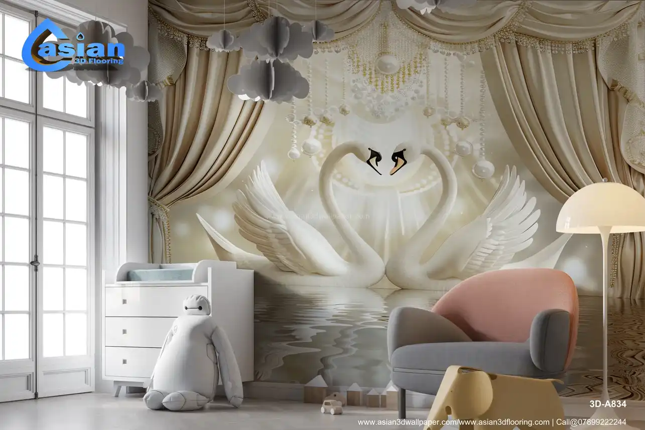 This stunning wallpaper showcases two elegantly intertwined swans, symbolizing love and harmony. The luxurious background adorned with shimmering pearls and draped curtains creates a romantic atmosphere, perfect for enhancing the elegance of any space. Ideal for bedrooms, living rooms, or event decorations, this design radiates beauty and sophistication, making it a perfect choice for those who appreciate fine art and aesthetic charm. Benefits:- Transform your space with this exquisite wallpaper, perfect for creating a serene and romantic ambiance in any room.