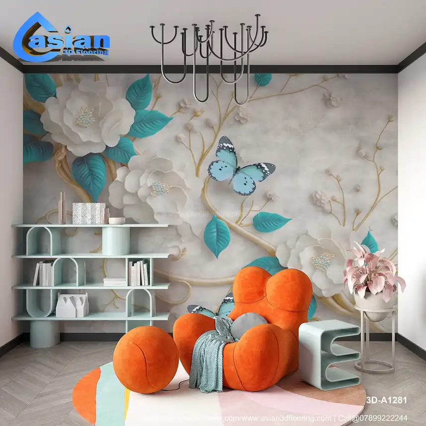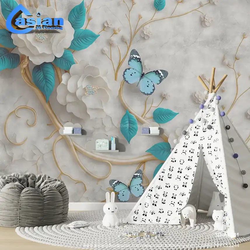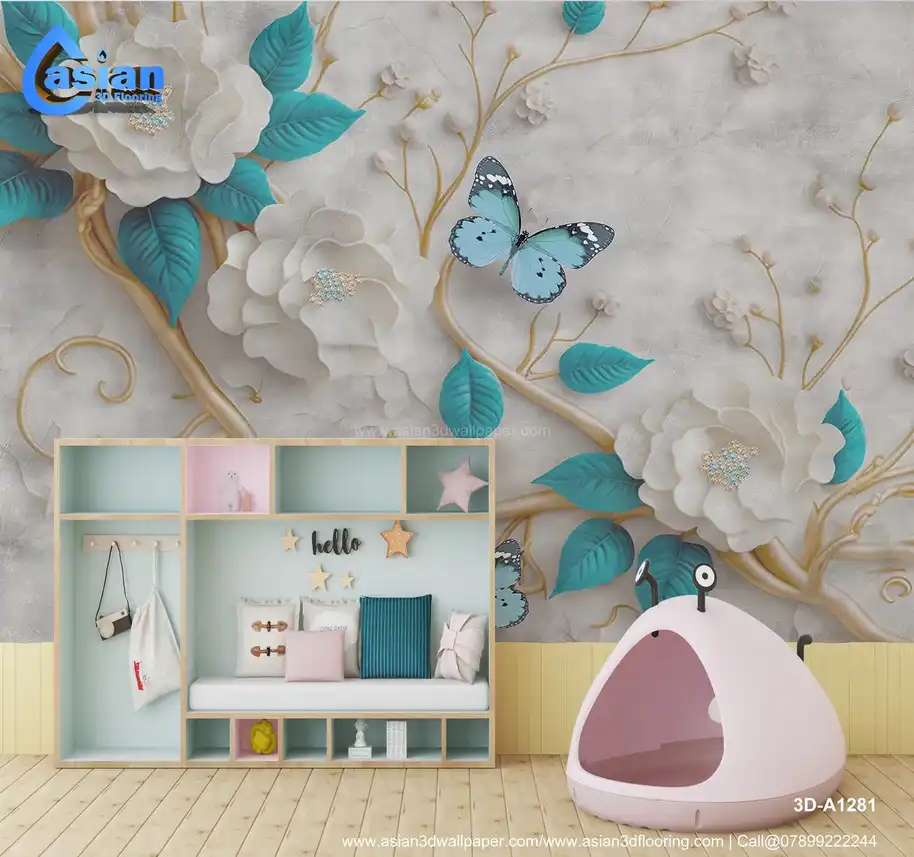 This luxurious wallpaper features large, elegant white flowers with teal leaves, accented by delicate butterflies in shades of blue. The intricate floral design, paired with soft pastel colors and golden branches, creates a serene and sophisticated atmosphere. Perfect for living rooms, bedrooms, or any space that needs a touch of nature's beauty and calmness. The combination of soft hues and realistic floral motifs makes this wallpaper ideal for creating a peaceful and refined interior design. Benefits:- Sophisticated design with white flowers, teal leaves, and butterflies, ideal for creating a tranquil and refined space.