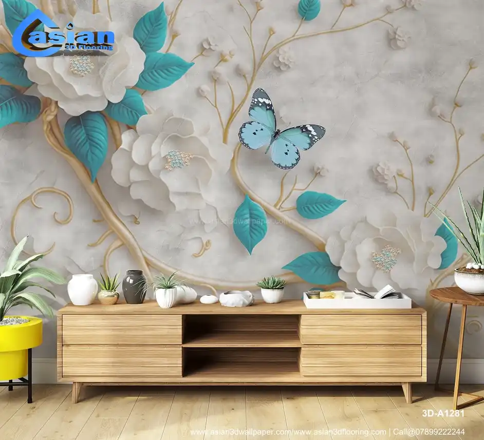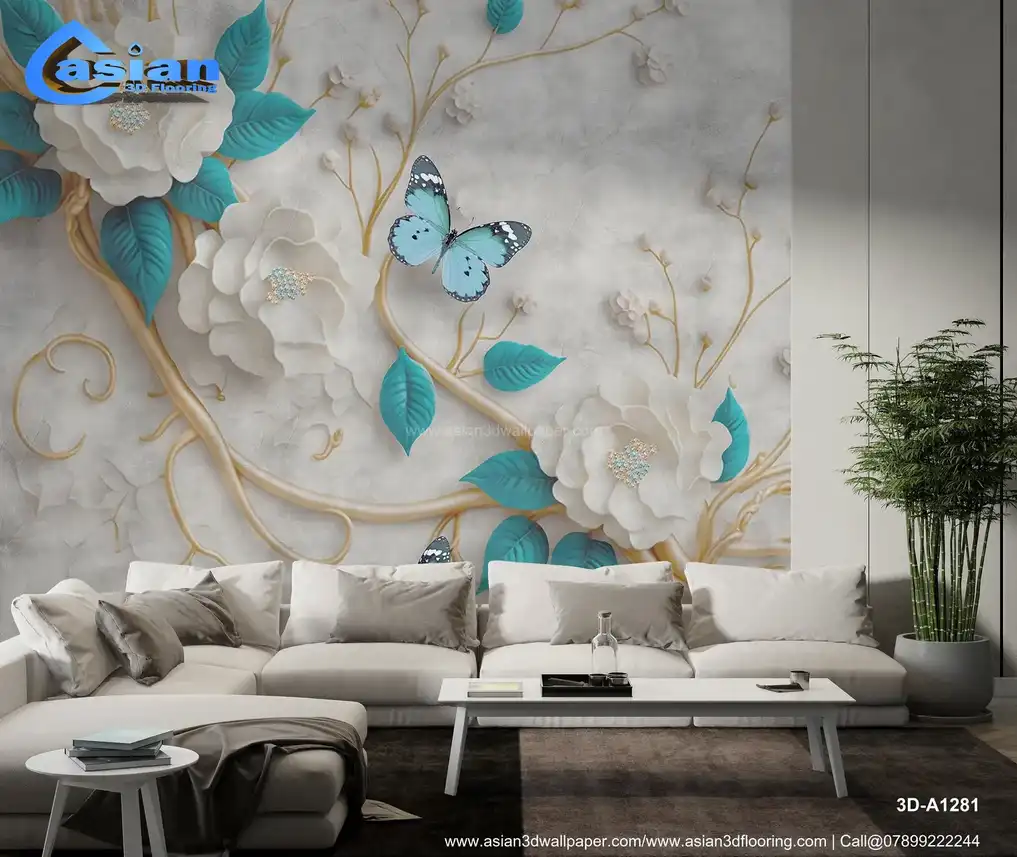 Elegant White Flowers with Teal Leaves and Butterflies Wallpaper||3D-A1281