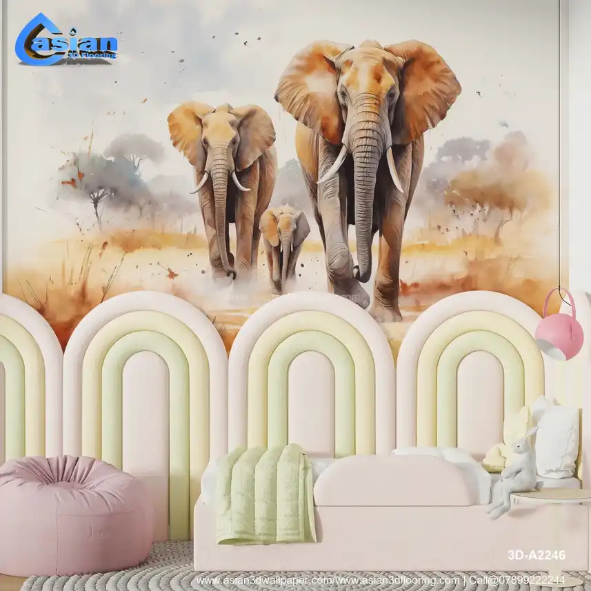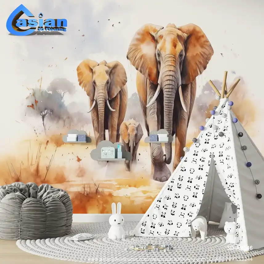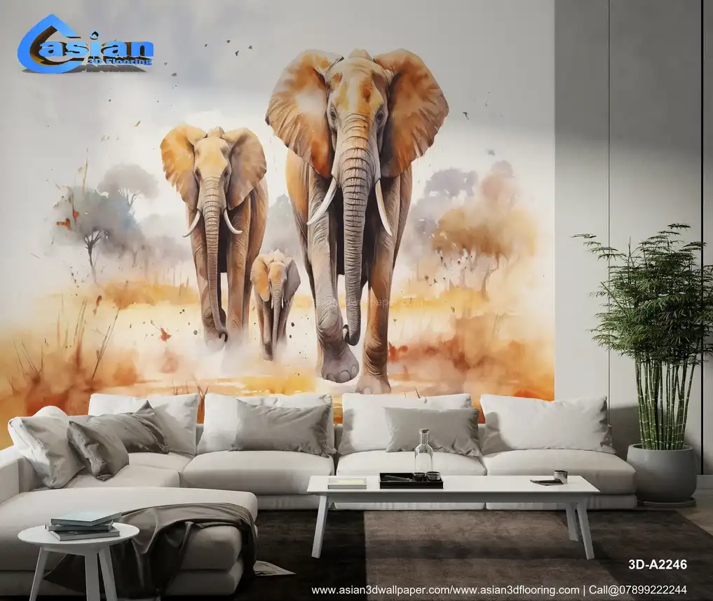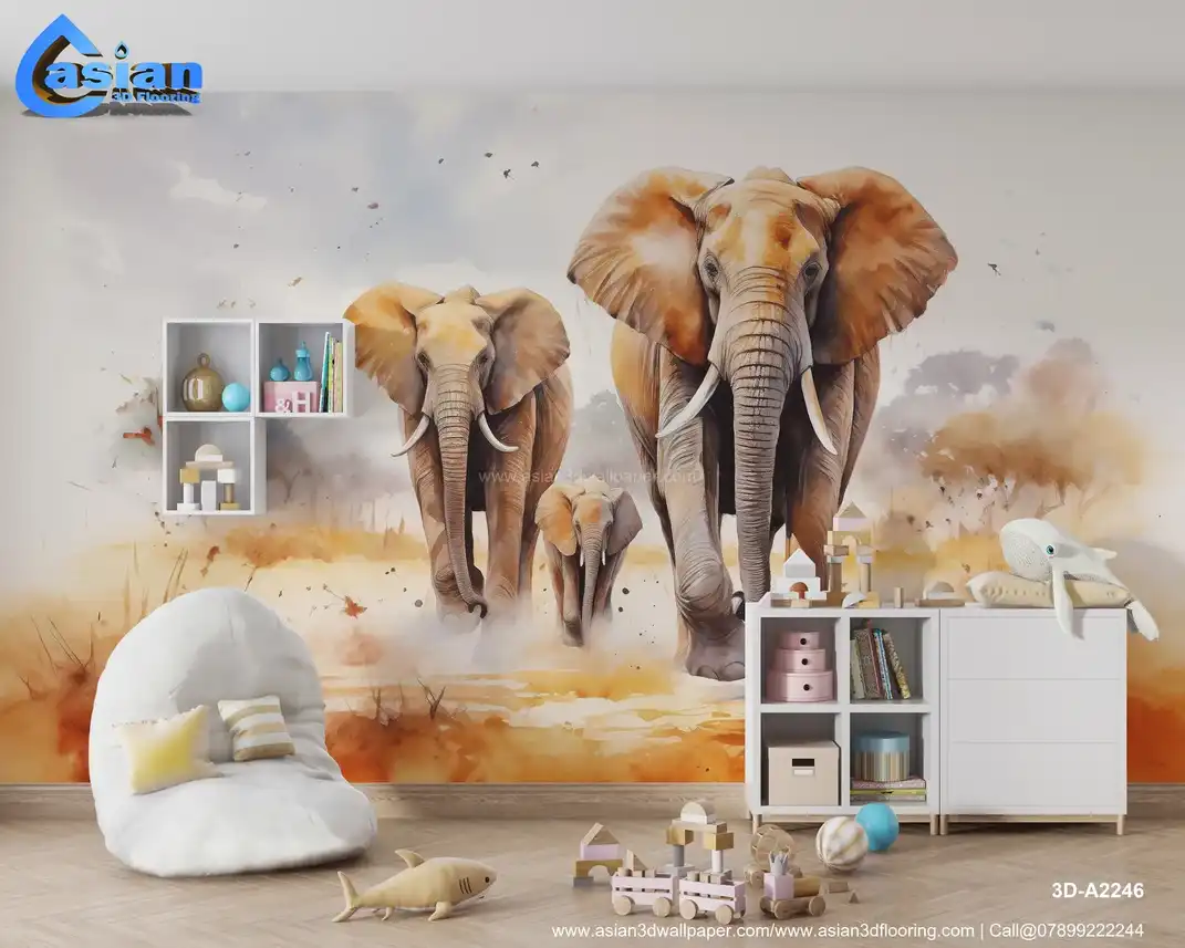 Elephant Family on the Savanna: Watercolor-Style Wildlife Art Print||3D-A2246