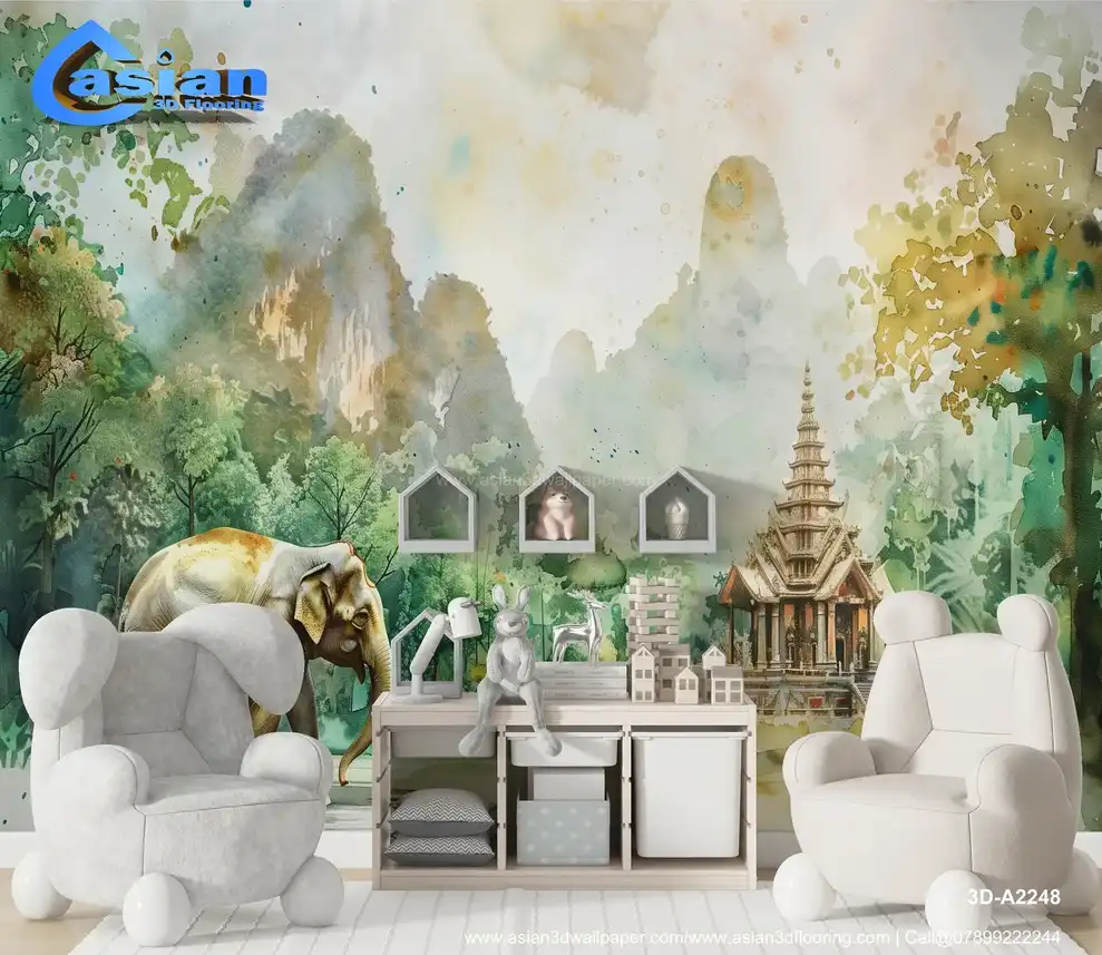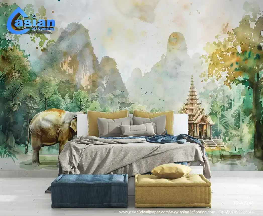 Elephant and Angkor Wat: Southeast Asian Landscape Watercolor Art Print||3D-A2248