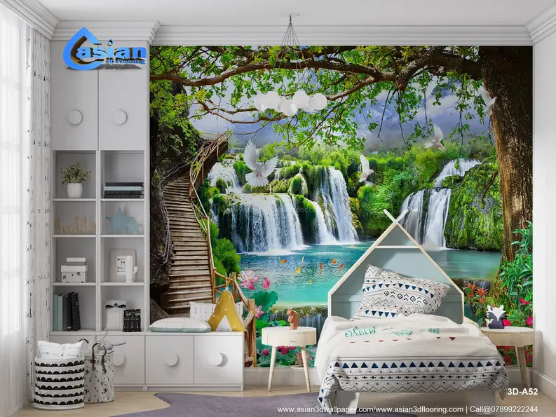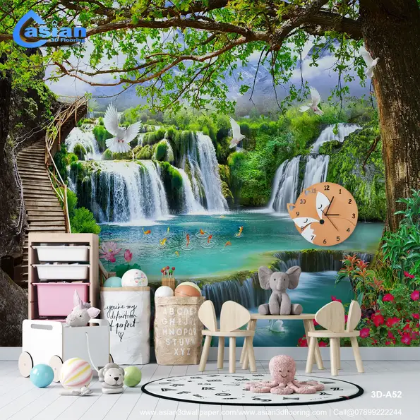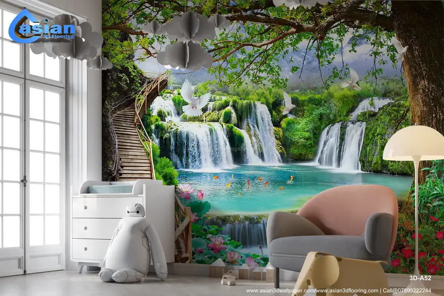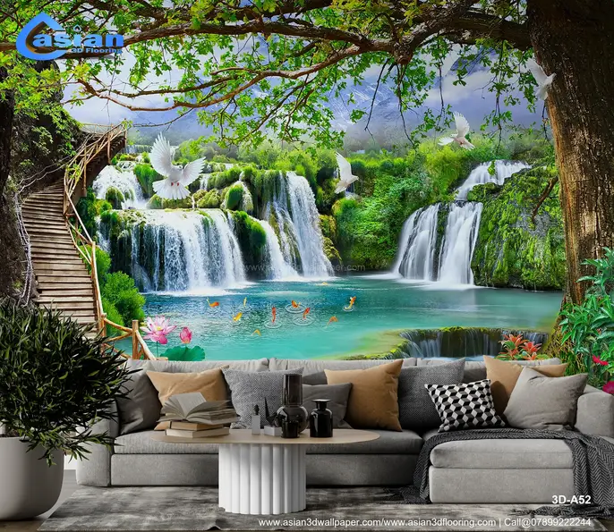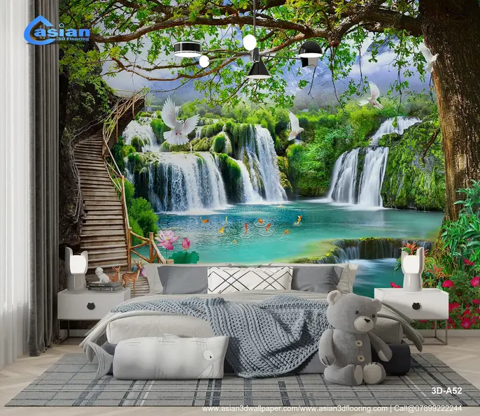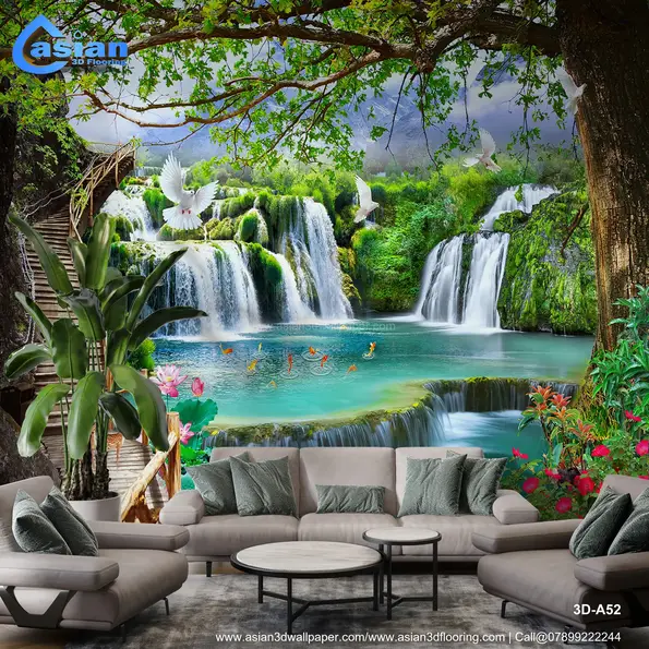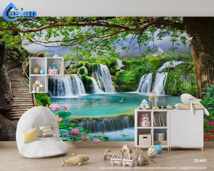Transform your space with this breathtaking wallpaper showcasing cascading waterfalls surrounded by lush greenery, colorful flowers, playful koi fish, and serene wildlife. A perfect blend of tranquility and natural beauty. Product Benefits :- Creates a serene and refreshing atmosphere. Adds depth and vibrancy to any room. Ideal for nature lovers and calming spaces.