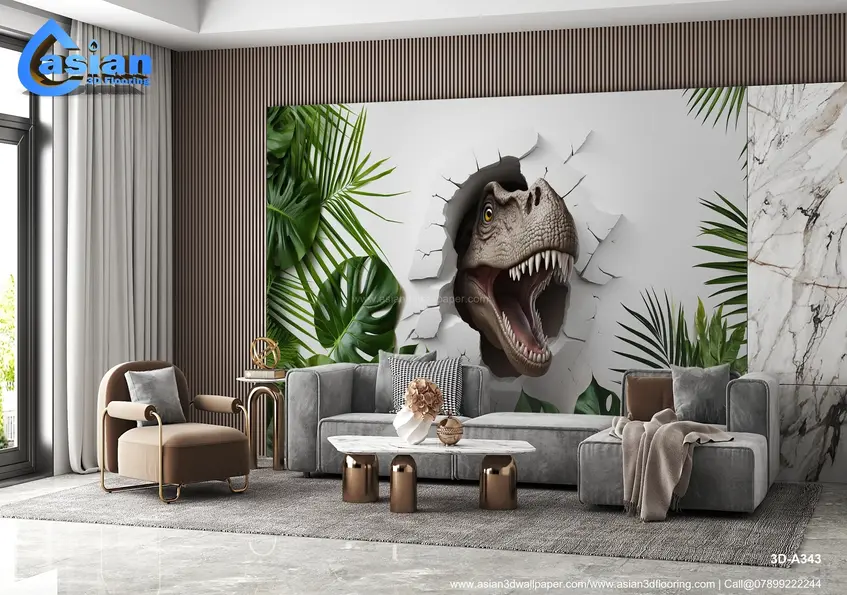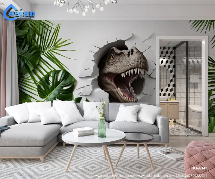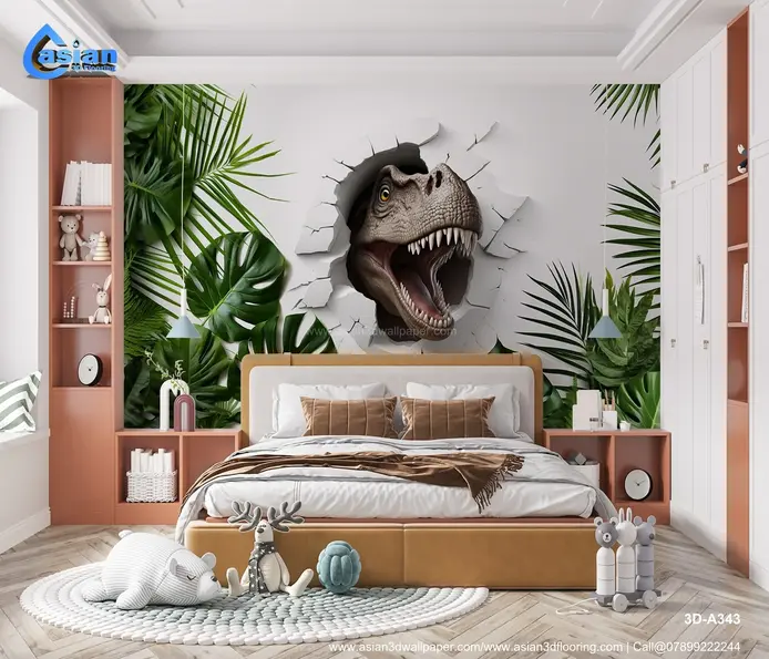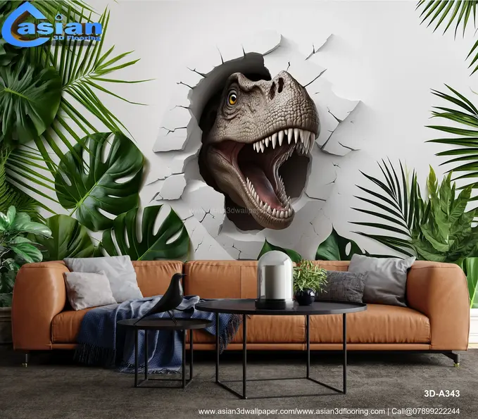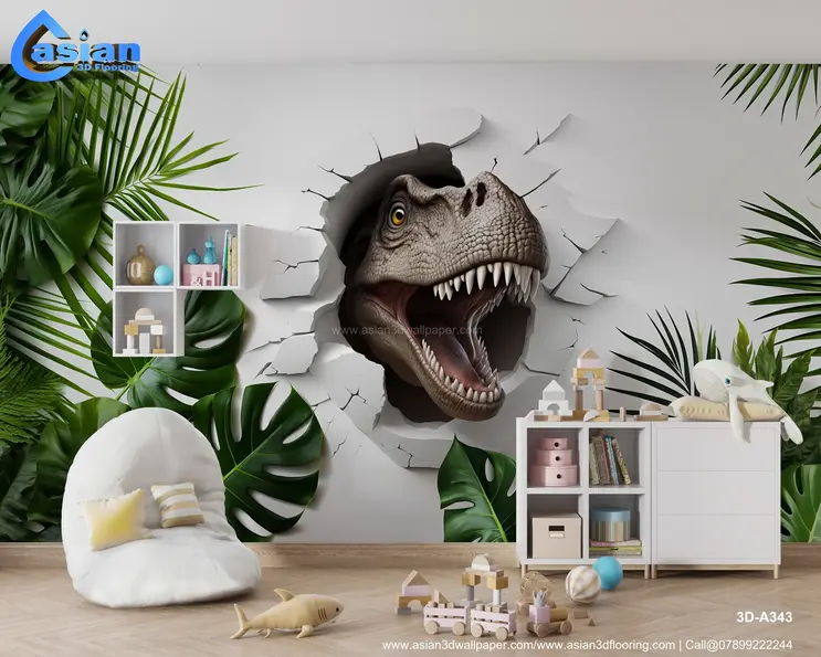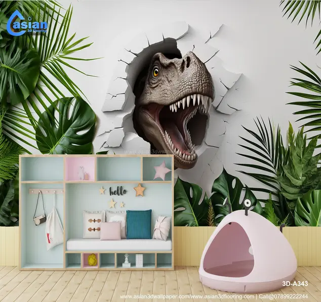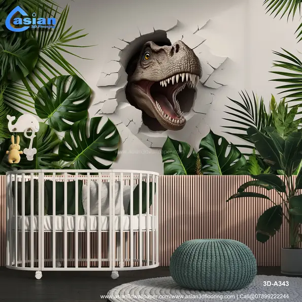 Bring excitement and adventure into any room with this dramatic 3D dinosaur mural. The lifelike T-Rex appears to break through the wall, surrounded by vibrant tropical leaves, creating an immersive prehistoric jungle atmosphere. Perfect for kids' rooms, themed playrooms, or entertainment spaces. Product Benefits :- Transforms any space into an adventurous jungle with its lifelike T-Rex design, perfect for children?s rooms or playful interiors that need a bold focal point.
