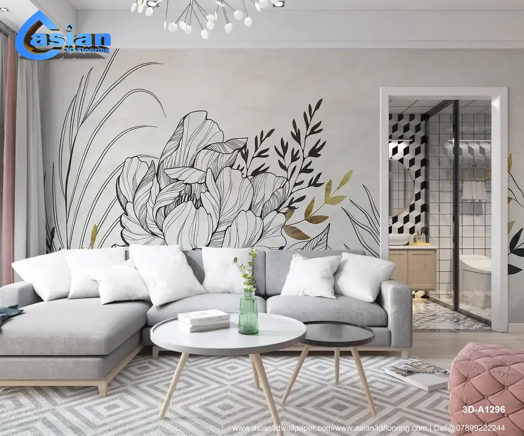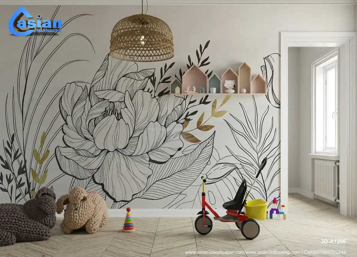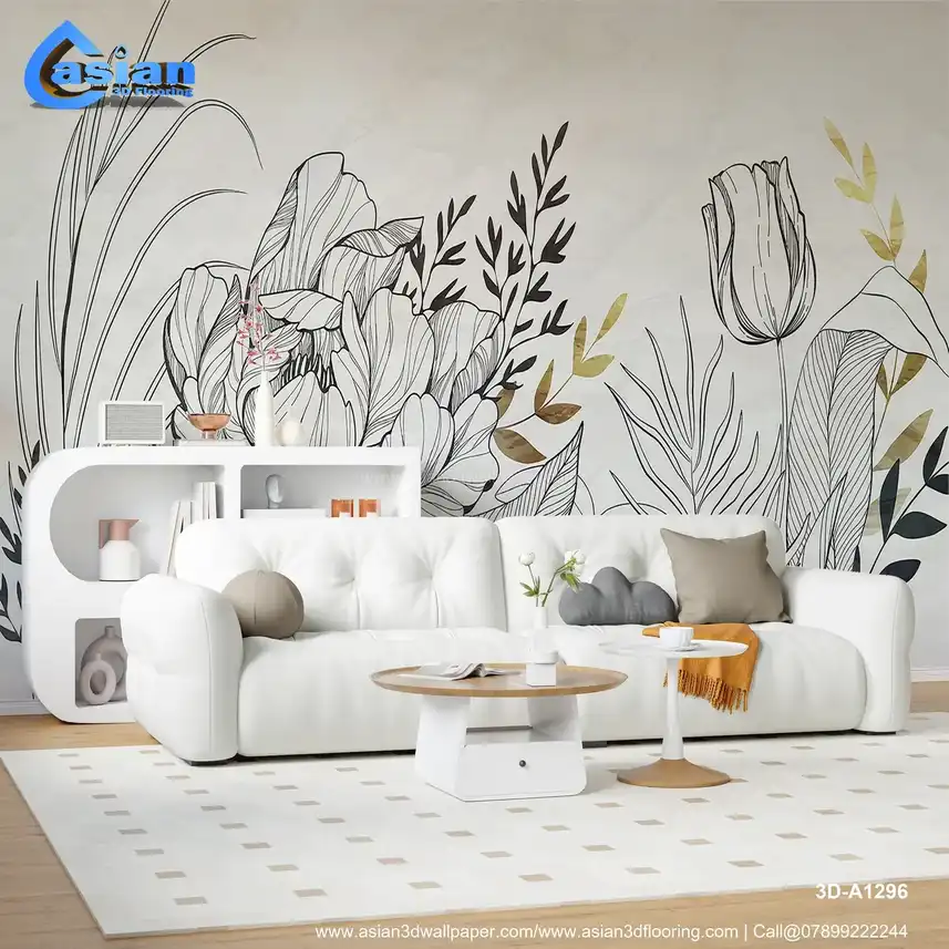 Floral Line Art Wallpaper with Elegant Gold Accents||3D-A1296