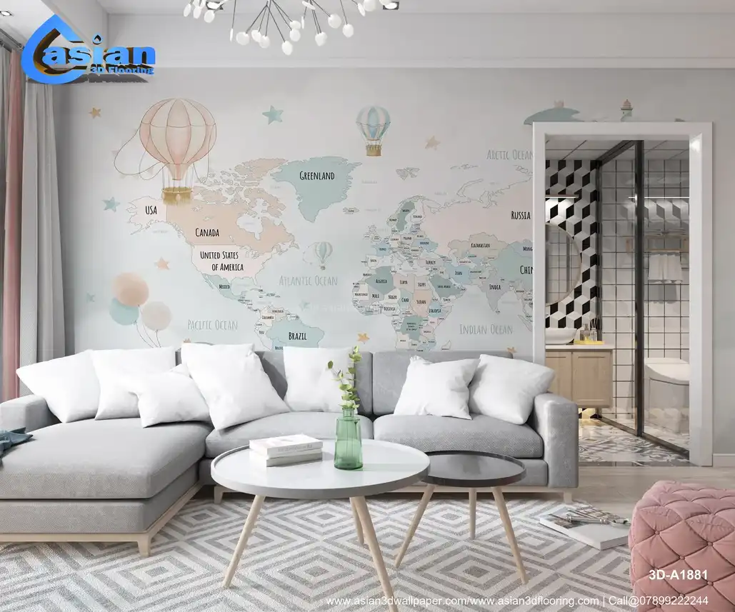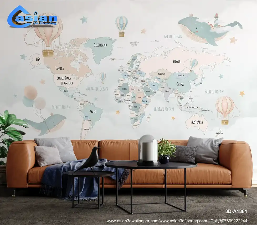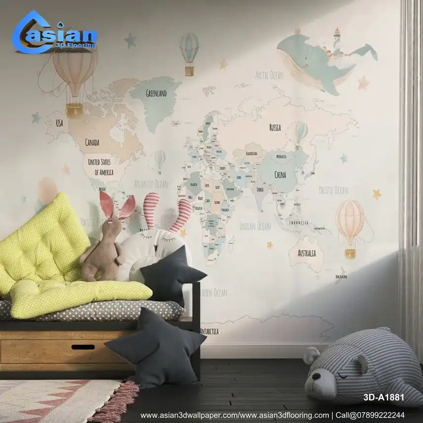 This playful world map wallpaper features soft pastel colors, hot air balloons, and a whale flying through the sky, making it perfect for kids' rooms and nurseries. A fun educational d?cor piece. Benefits:- Bring adventure and learning to life in your child's room with this world map wallpaper featuring pastel hot air balloons, a floating whale, and a fun, imaginative design.