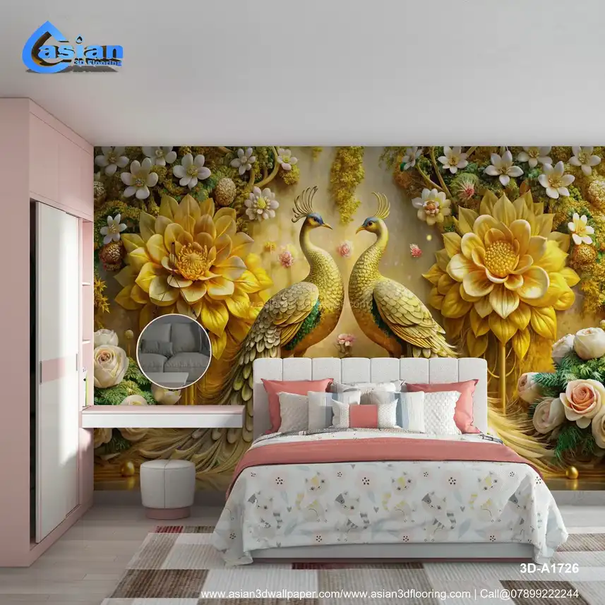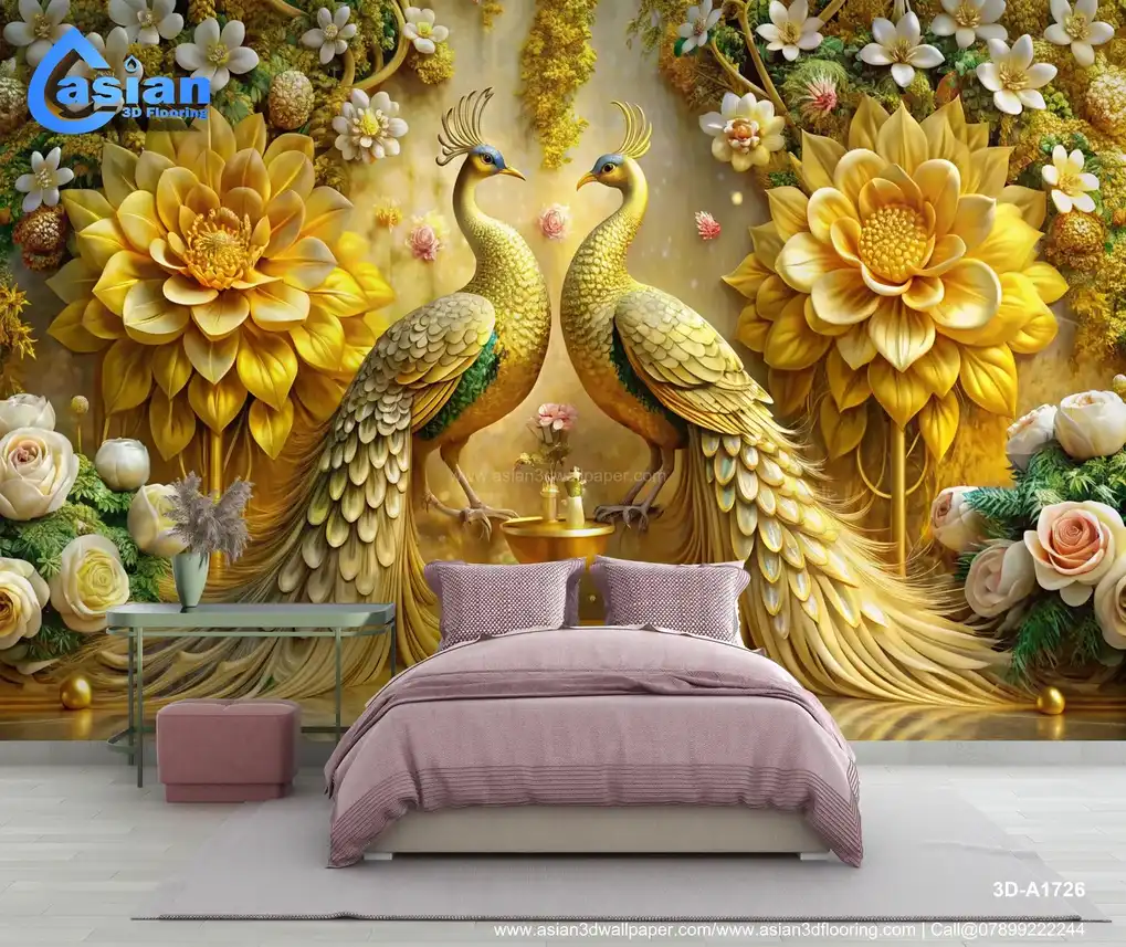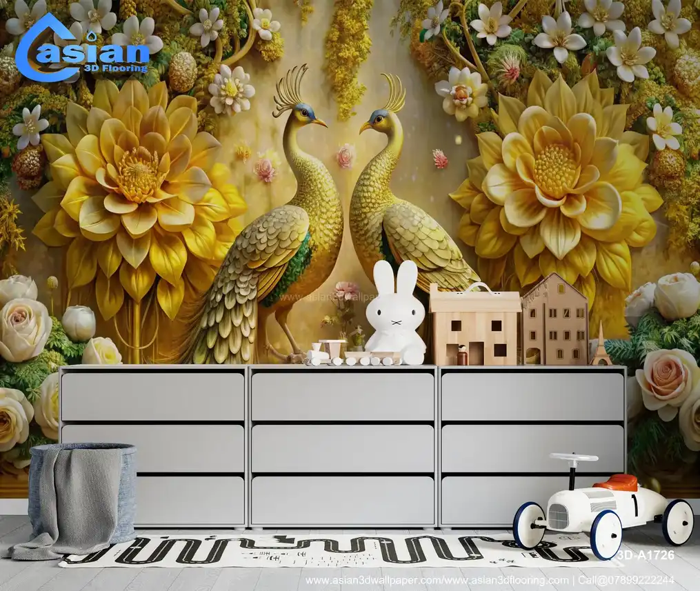 A stunning 3D art sculpture featuring golden peacocks surrounded by vibrant, detailed flowers, symbolizing beauty and elegance in nature, perfect for luxury home d?cor and art lovers. Benefits:- A breathtaking 3D sculpture depicting golden peacocks with intricately designed flowers, symbolizing nature?s elegance.