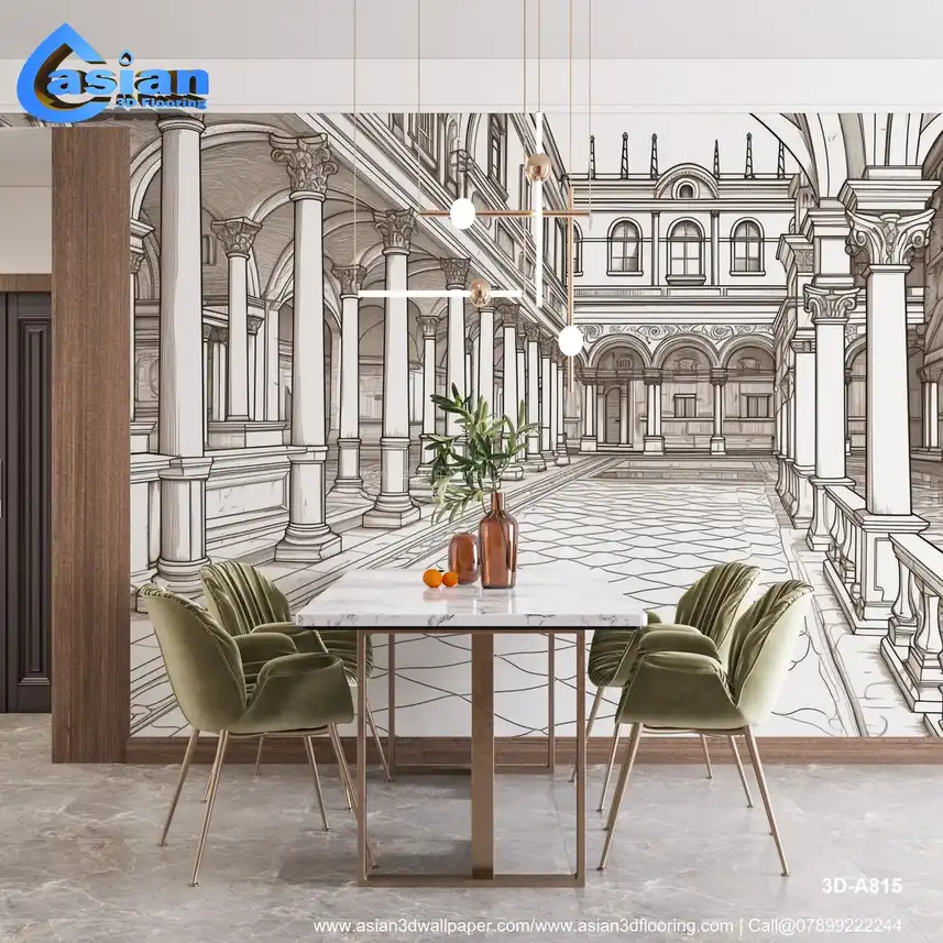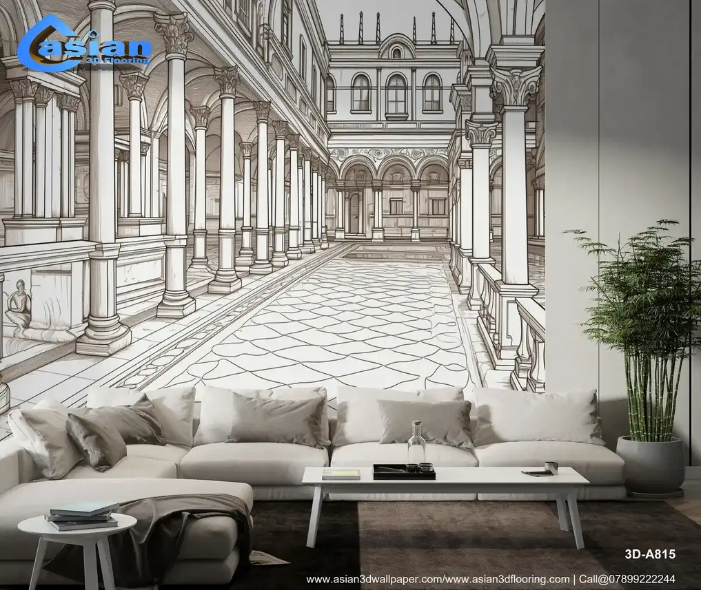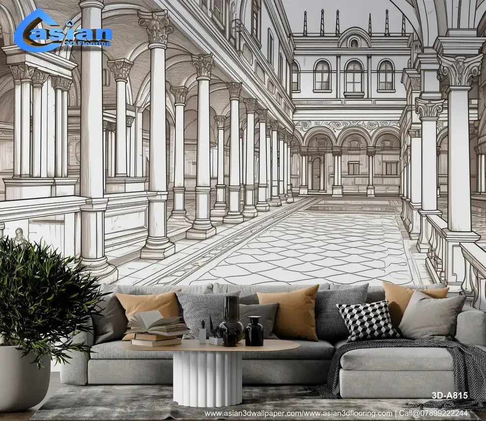 This intricate architectural drawing showcases a grand courtyard, featuring elegantly designed columns, detailed flooring, and an inviting atmosphere. Ideal for architects, designers, or art lovers, this image emphasizes the beauty of classical architecture, serving as an excellent reference for creative projects or inspiration for interior design. Benefits:- Enhance your artistic projects with this detailed courtyard drawing, perfect for architectural presentations, design inspirations, or as a captivating piece for your decor.