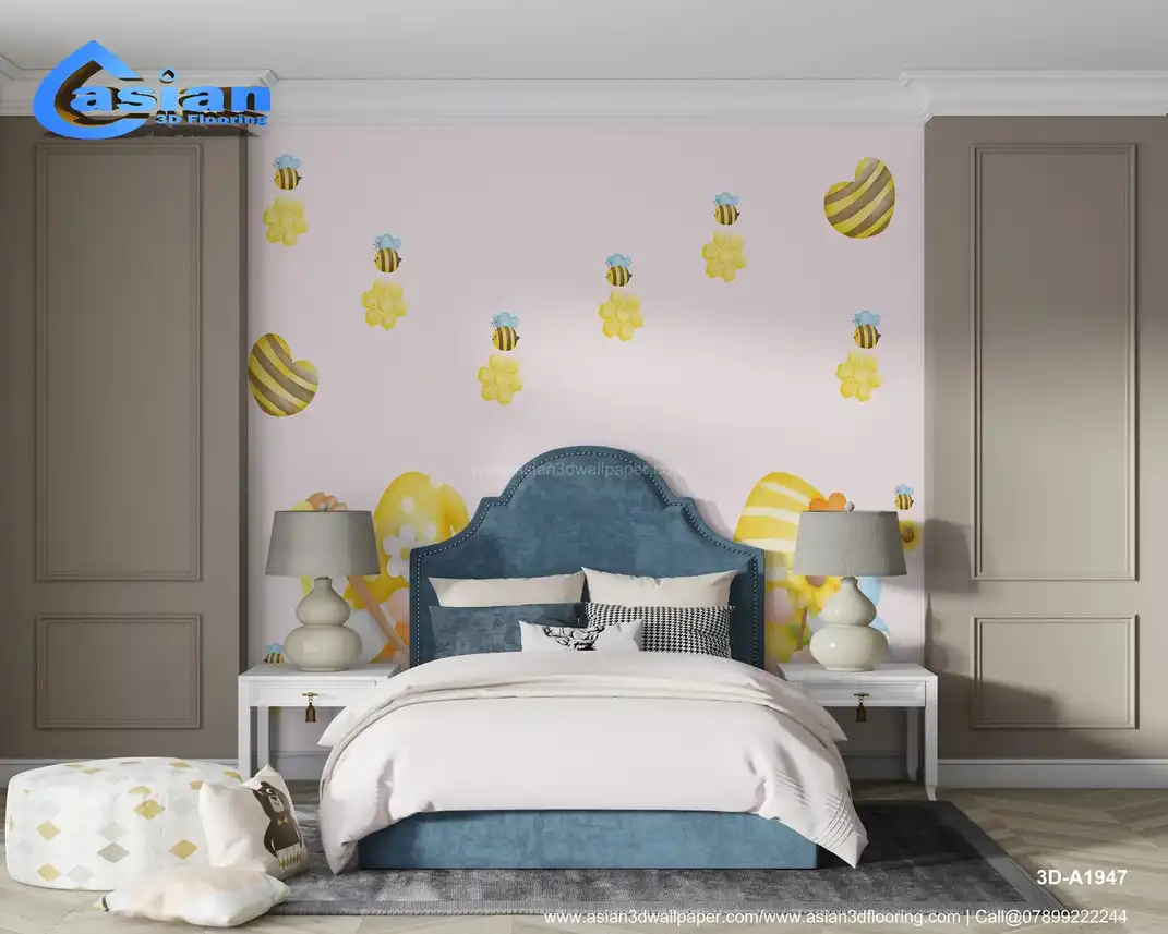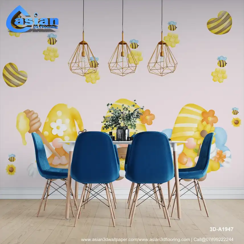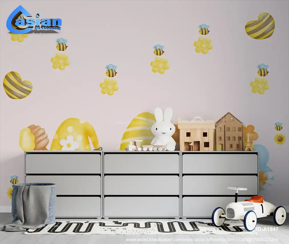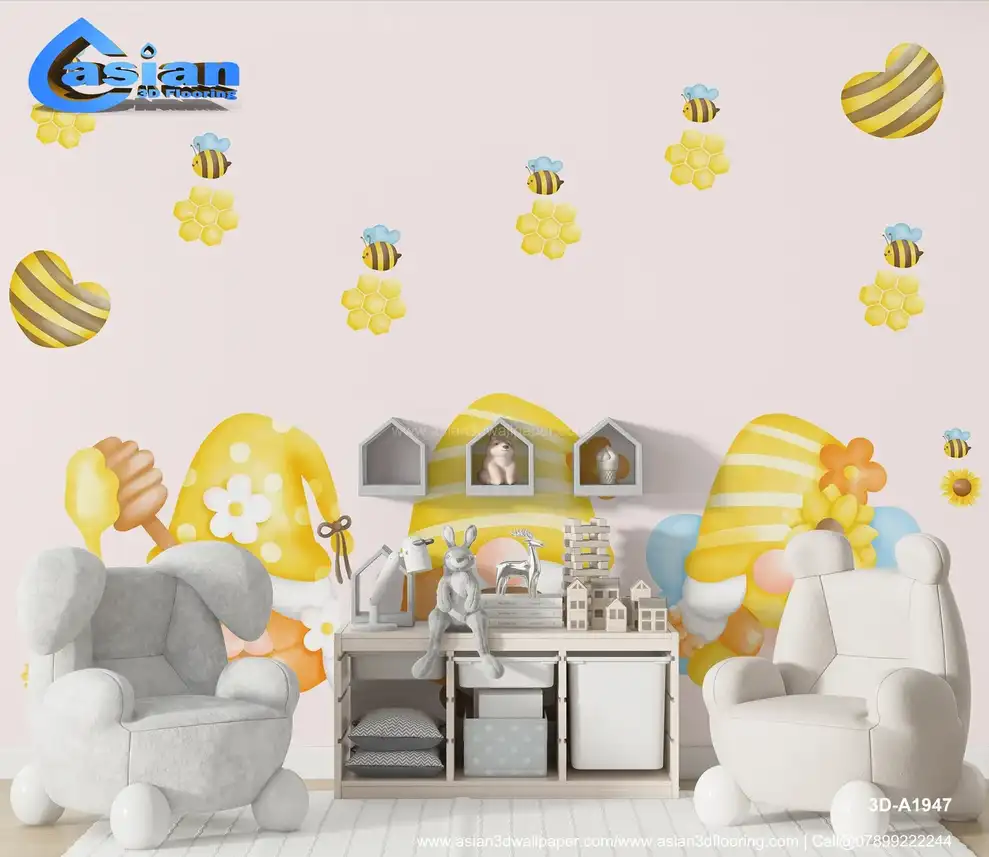 This whimsical wallpaper features adorable gnomes dressed in yellow and orange, holding honey dippers and surrounded by playful honey bees and honeycomb designs. The soft pastel colors and floral accents create a cheerful, nature-inspired atmosphere, making it perfect for children's rooms, nurseries, or bee-themed spaces. The sweet and cozy design captures the warmth of spring and summer, perfect for adding a joyful touch to any room. Benefits:- This cute wallpaper features honey bee gnomes, honeycombs, and flowers, perfect for creating a cheerful and nature-inspired atmosphere in any room.