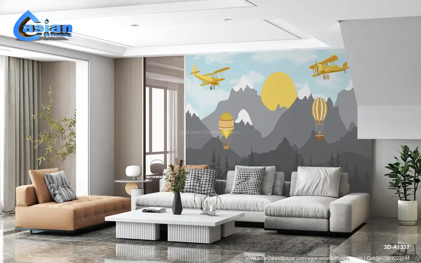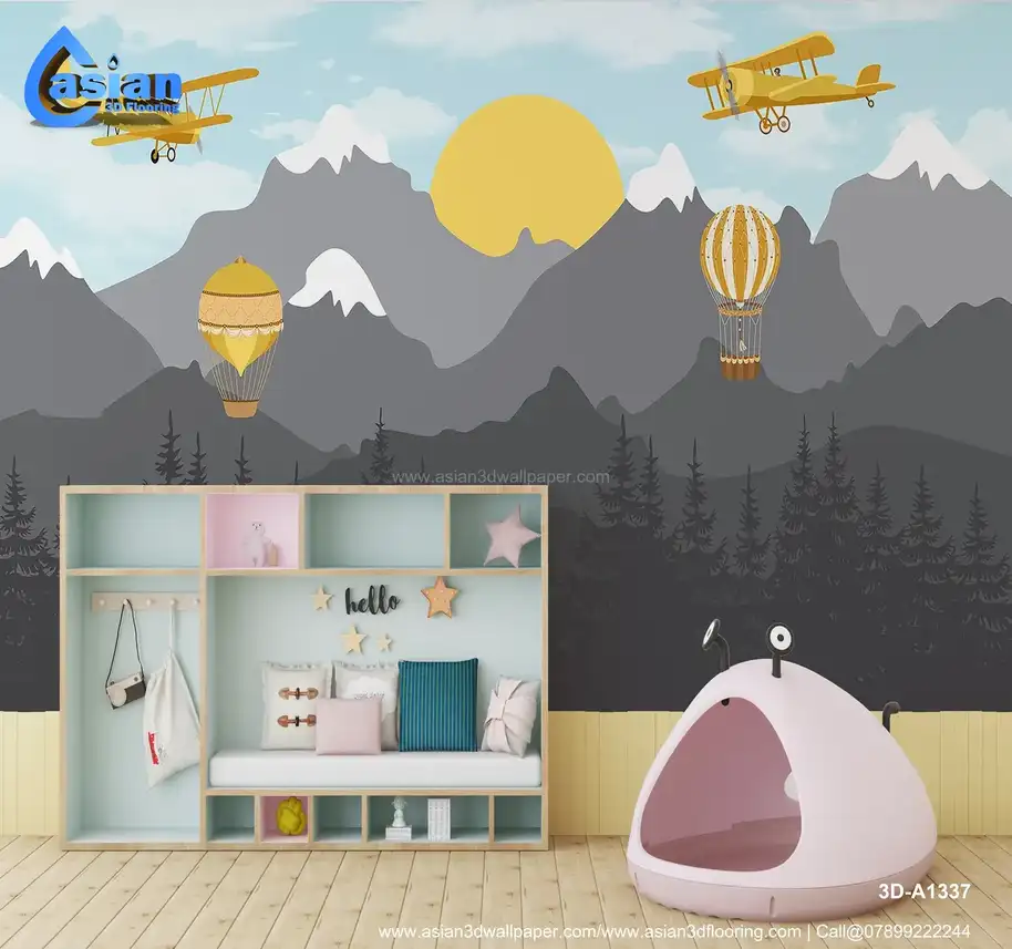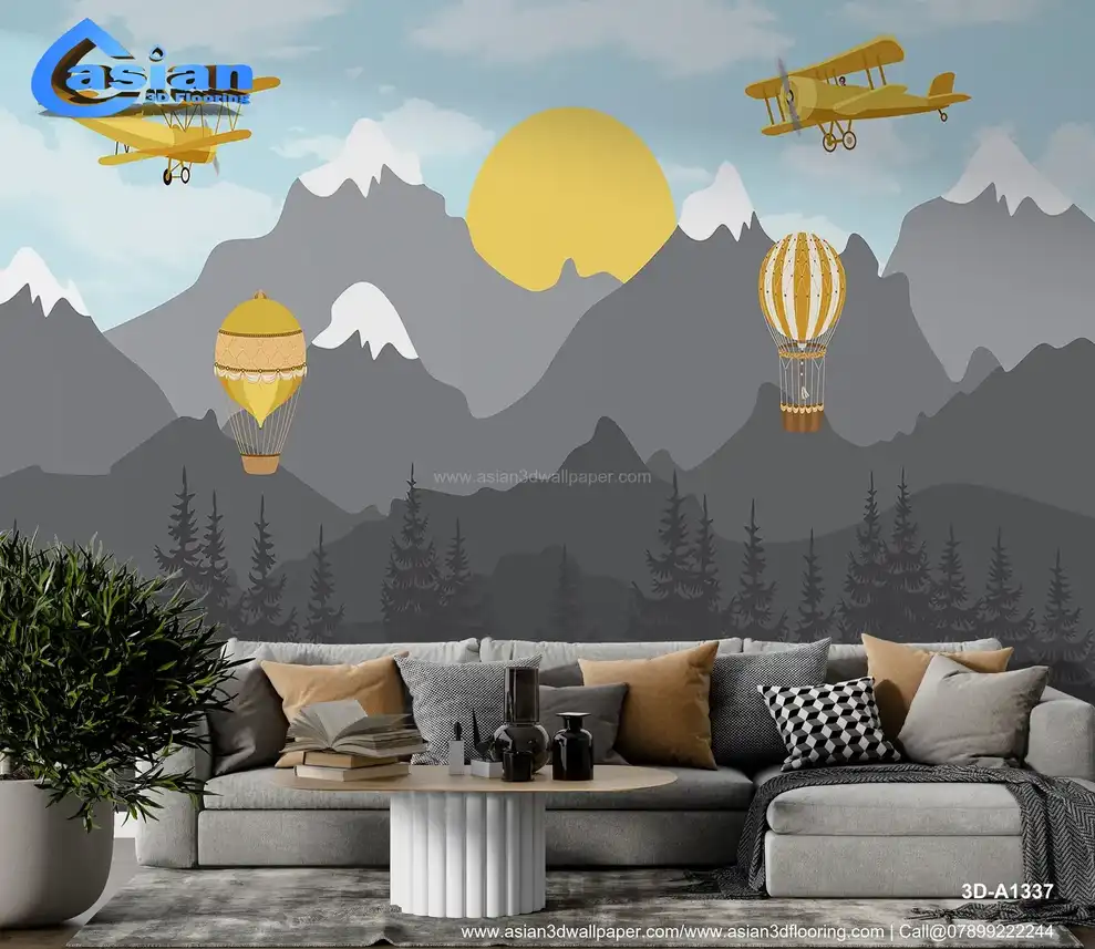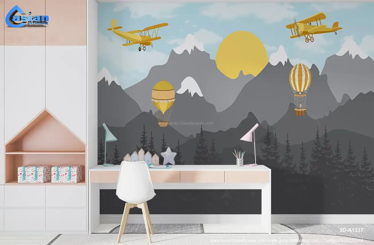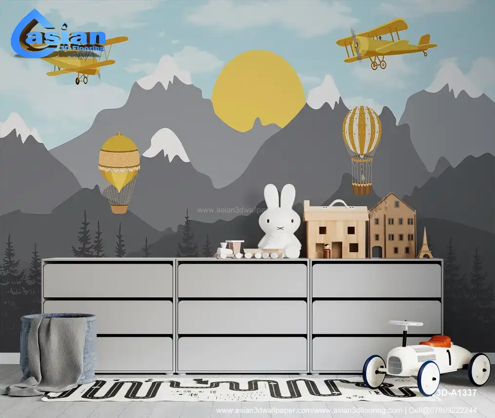 This charming wallpaper features a serene mountain landscape with vintage-style hot air balloons and a yellow airplane soaring across the sky. The warm yellow tones against cool mountain backdrops create a dreamy, adventurous atmosphere for any room. Benefits:- A peaceful yet adventurous design featuring a mountain backdrop, vintage hot air balloons, and an airplane, perfect for a travel-themed room.