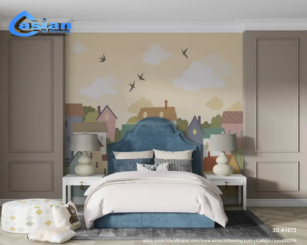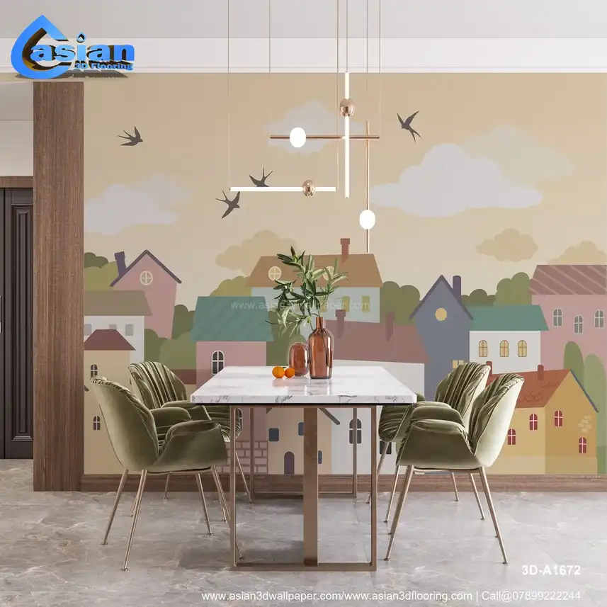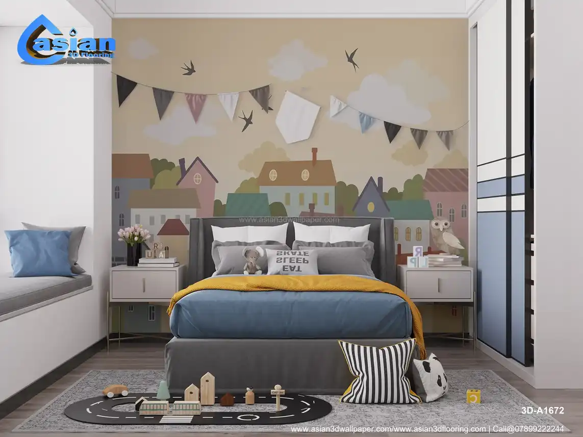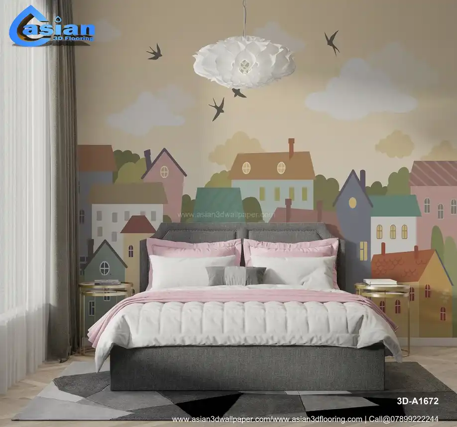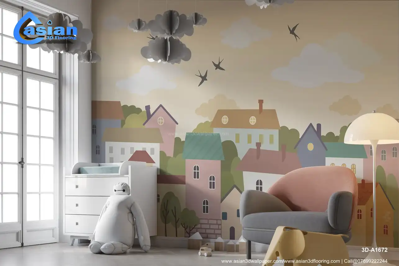 Kids Cityscape Wallpaper with Houses and Birds||3D-A1672