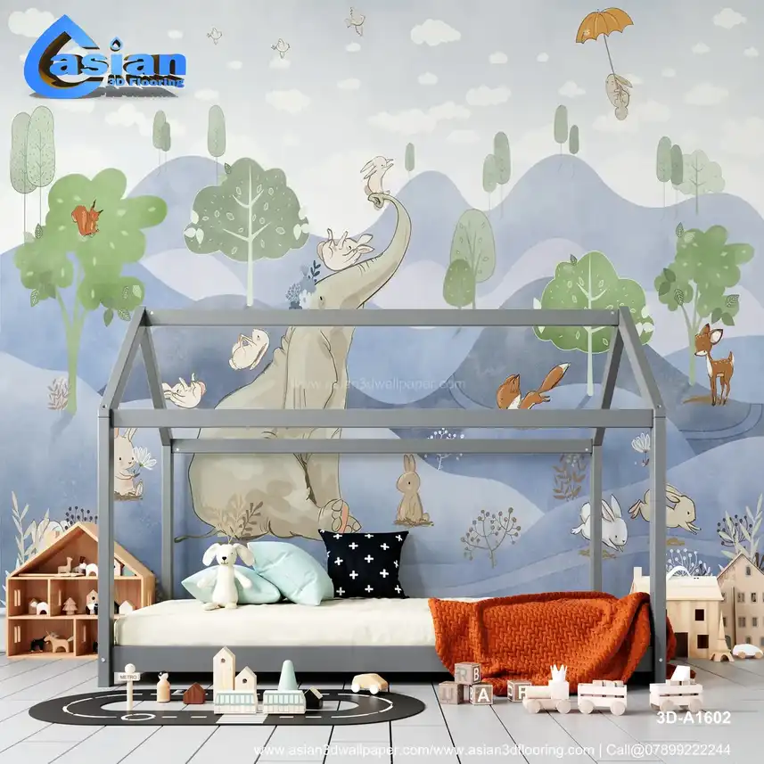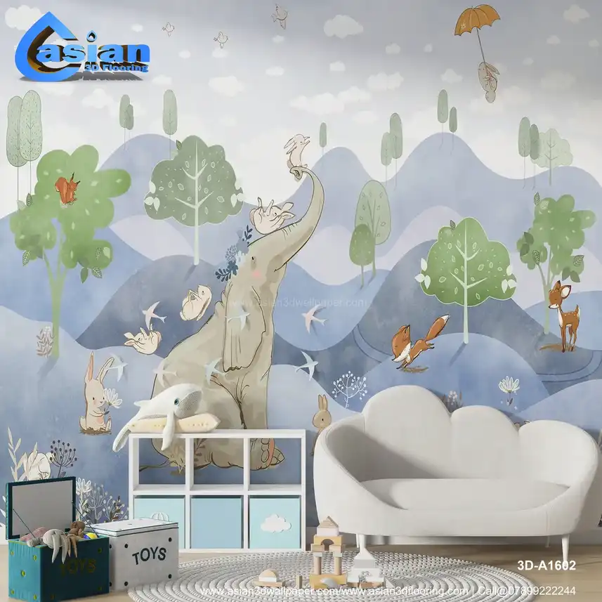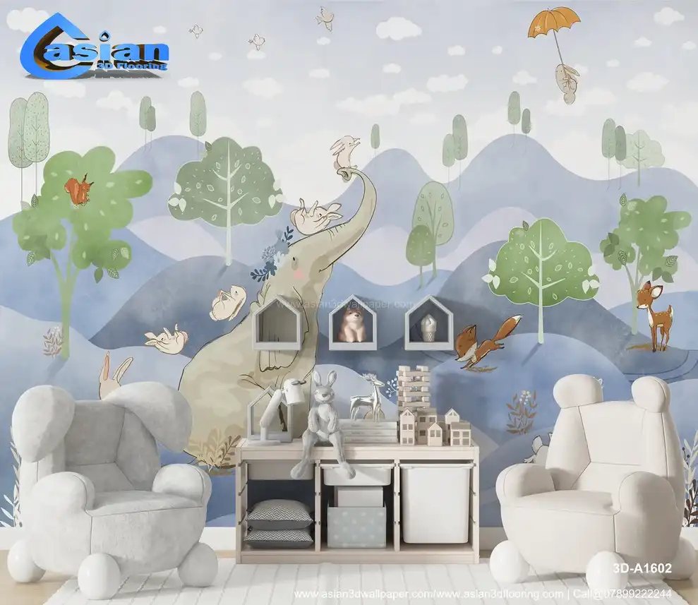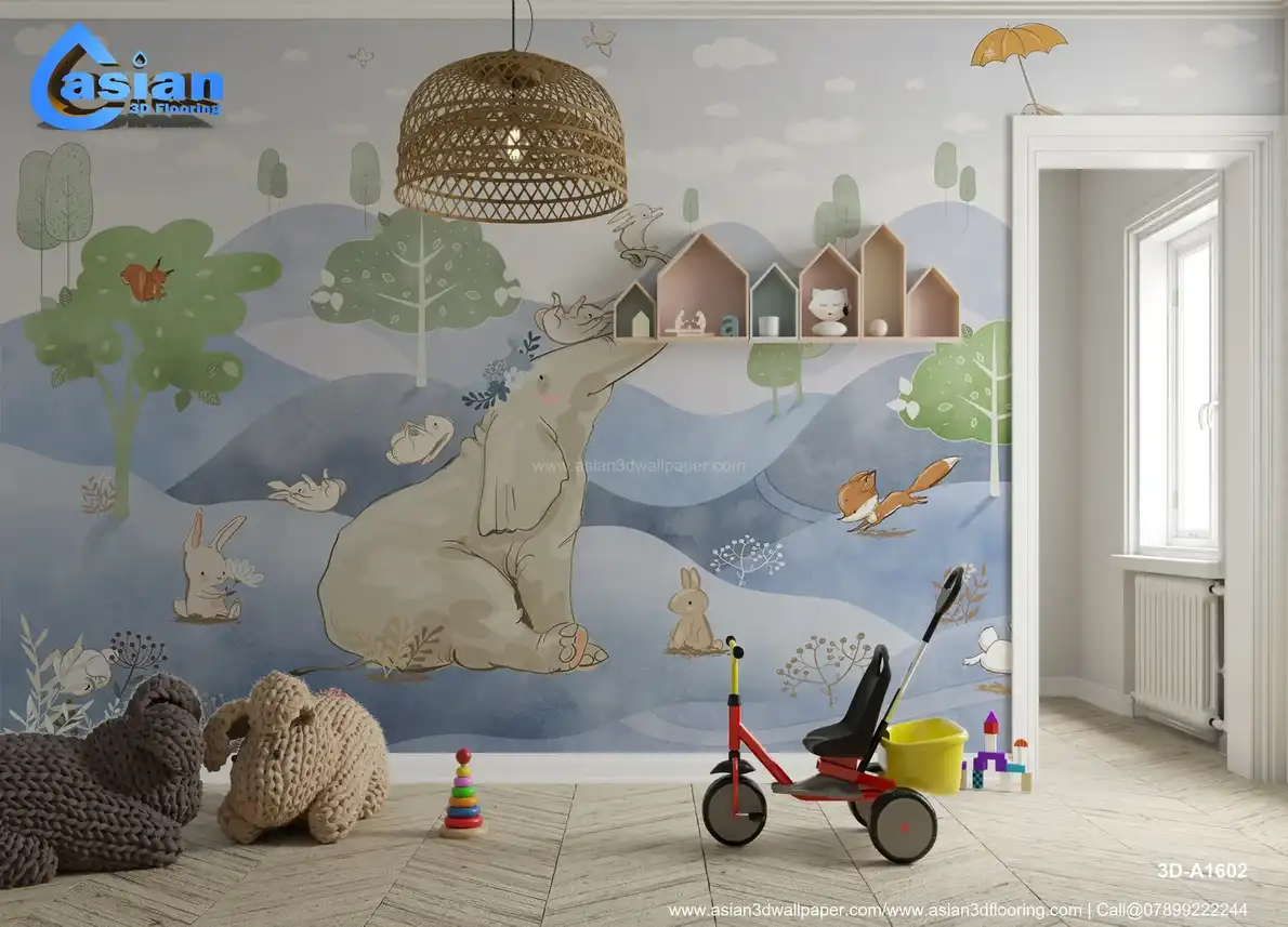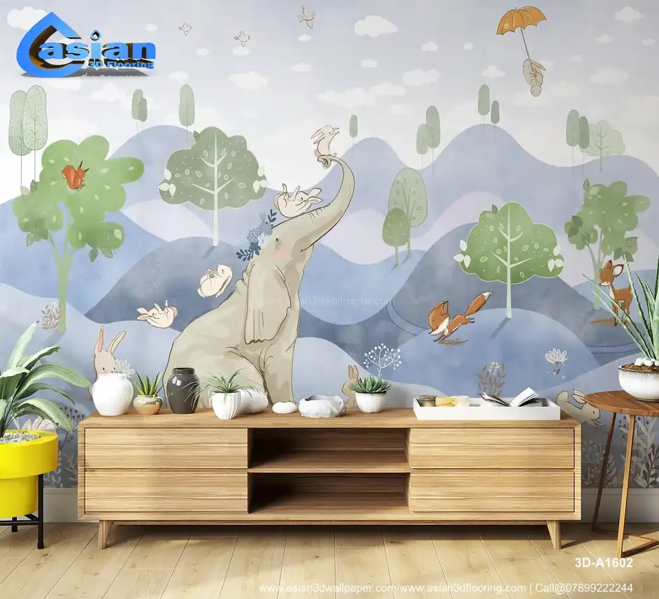 Light-Blue Forest with Elephant and Playful Animals||3D-A1602