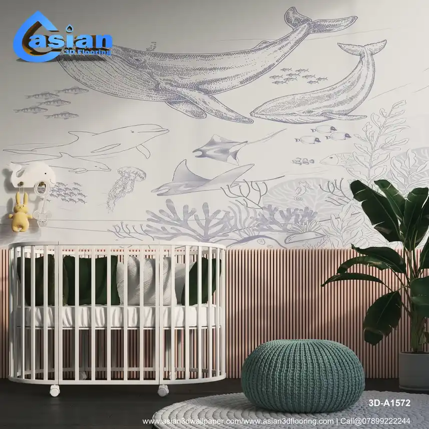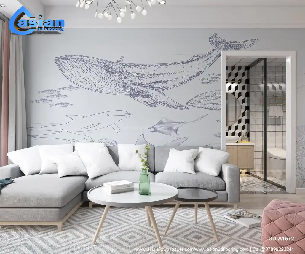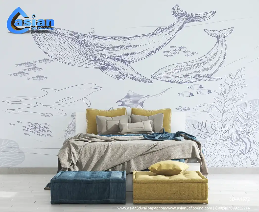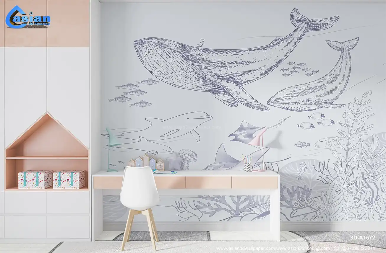 Light Blue Underwater Marine Life Wallpaper with Whales & Dolphins||3D-A1572