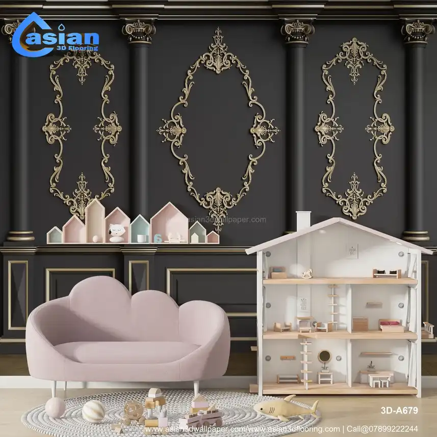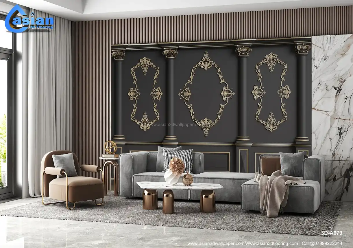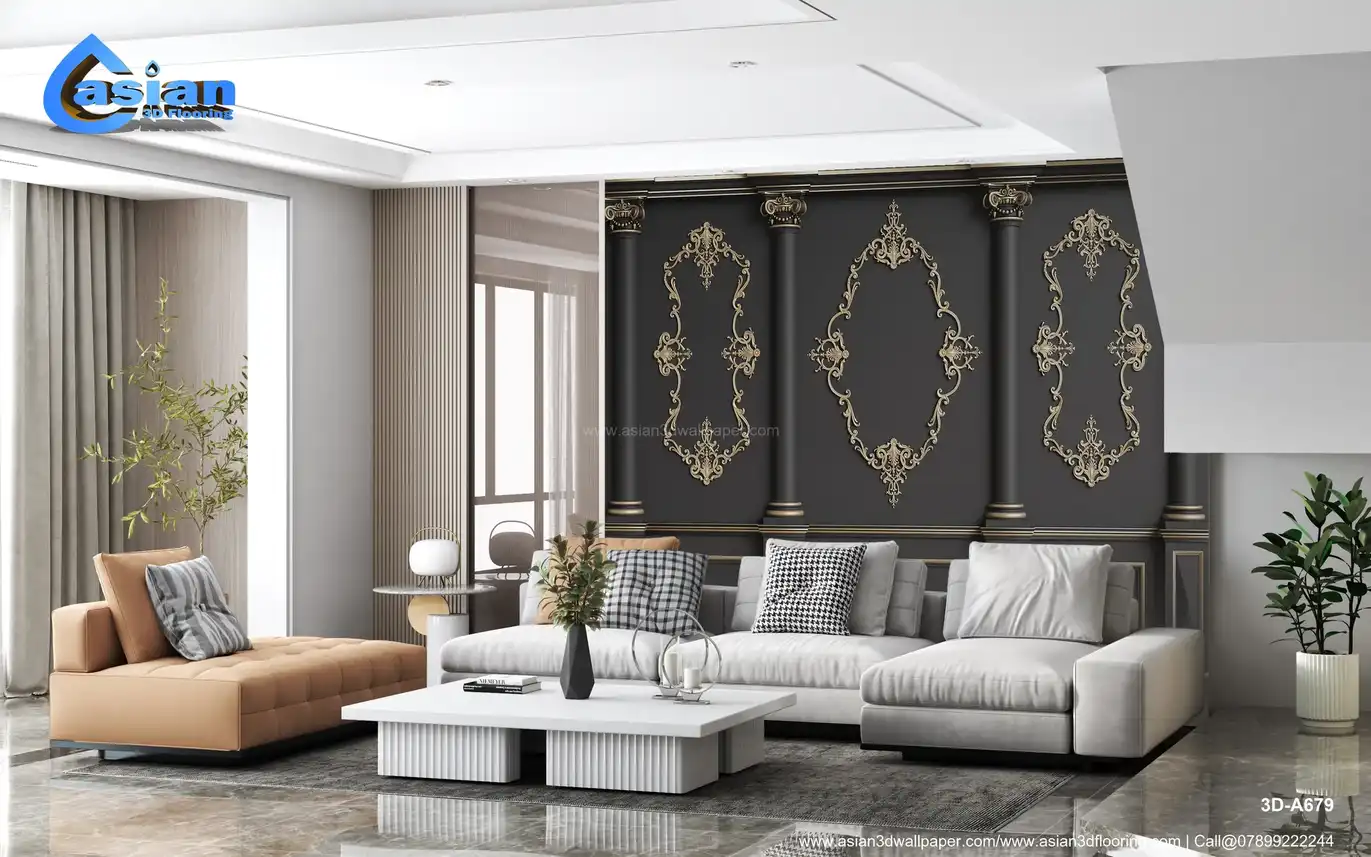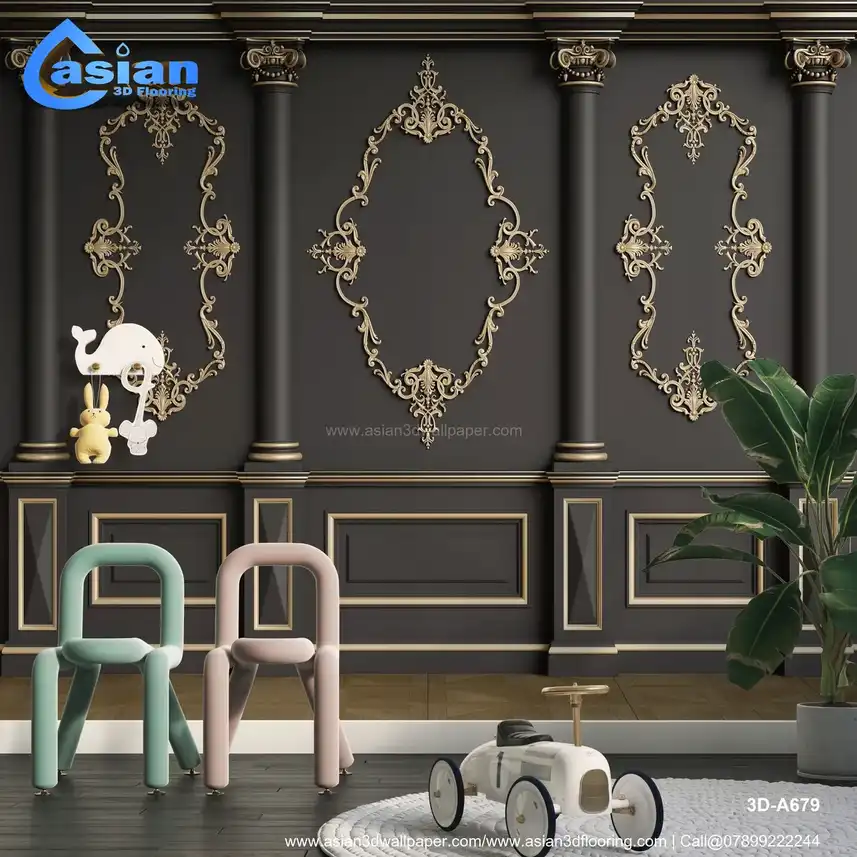 This stunning image features luxurious decorative wall frames embellished with intricate gold detailing on a sleek black backdrop. The ornate designs and classic columns create a regal atmosphere, ideal for upscale interior design. Perfect for adding a touch of sophistication and elegance to any space, this design serves as a statement piece for home or office d?cor. Benefits:- Enhances the visual appeal of your interiors, perfect for creating an elegant ambiance, ideal for luxury design enthusiasts