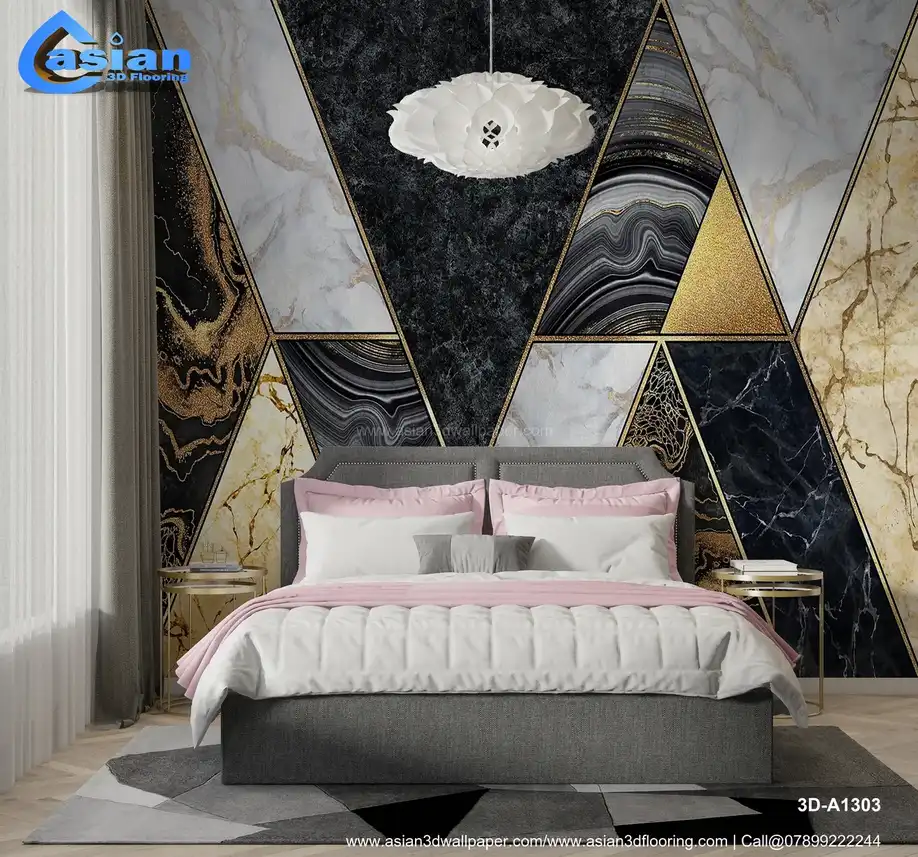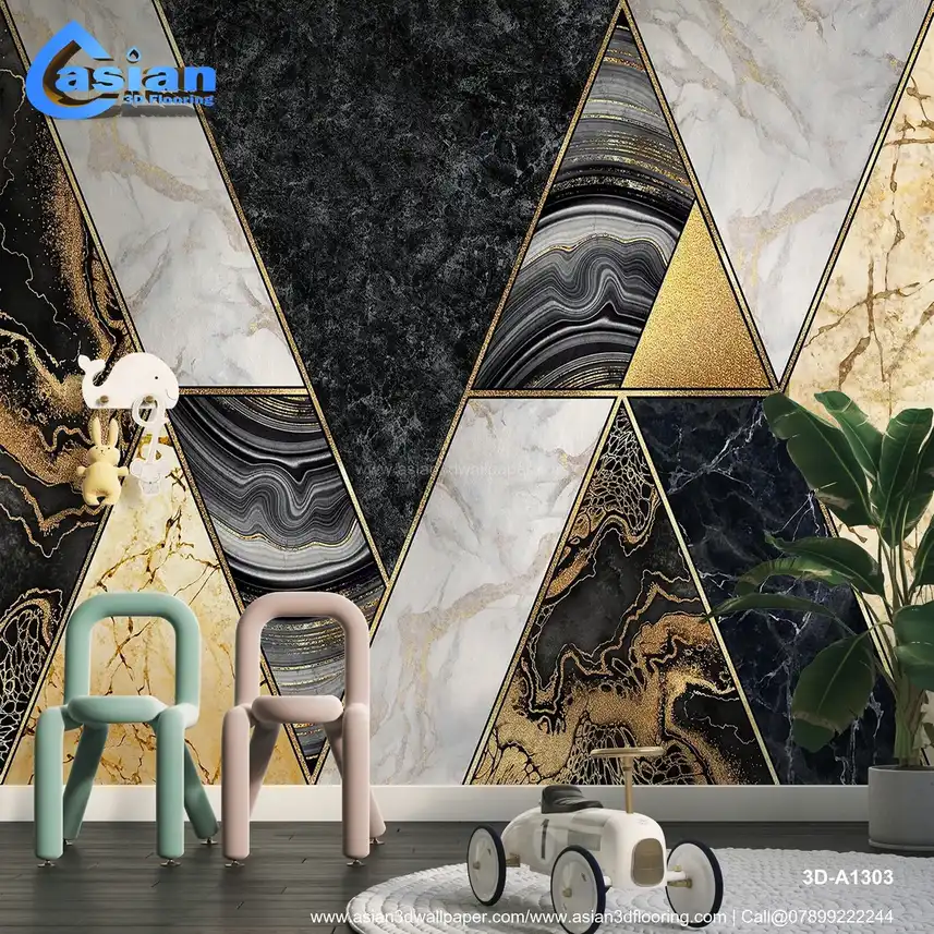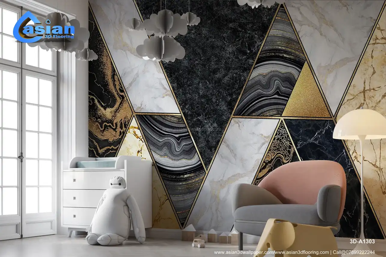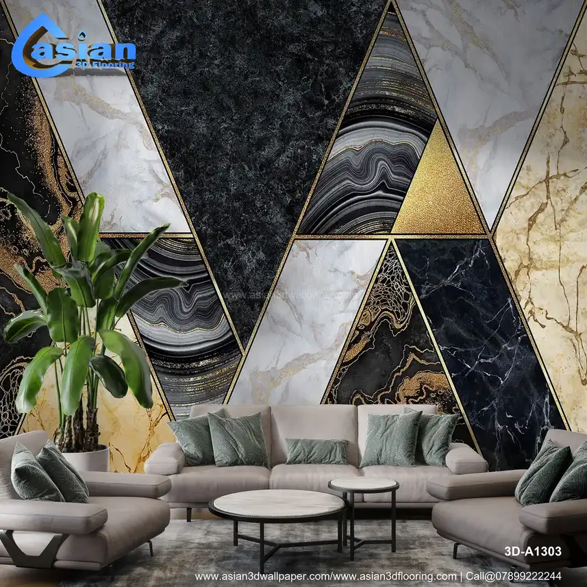 Elevate your interiors with this luxurious marble geometric wallpaper. Featuring a bold mix of dark and light marbles with metallic gold accents and sleek triangular patterns, this wallpaper adds a touch of sophistication and elegance to any space. The contrasting shades of black, white, and gold are complemented by smooth marble veins and a modern geometric design, perfect for high-end living rooms, bedrooms, or offices. This stunning wallpaper brings a sense of grandeur while keeping your space contemporary and chic. Benefits:- Transform your space with the elegant luxury of marble geometric patterns and golden accents.